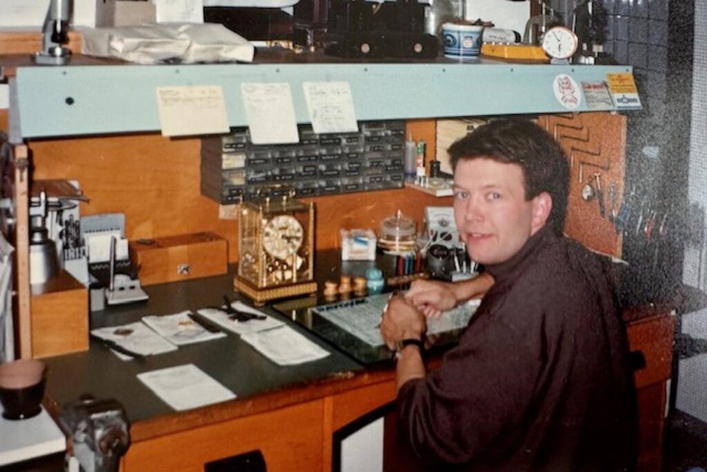 De werkbank is sindsdien altijd het hart van de winkel gebleven. Op een foto van bijna 40 jaar geleden, is Arjo geconcentreerd aan het werk. En zelfs nu zit hij daar nog, met dezelfde toewijding, precisie en liefde voor het vak. Of het nu gaat om het repareren van een erfstuk of het ontwerpen van een nieuw sieraad: de werkbank blijft de plek waar traditie en techniek samenkomen.