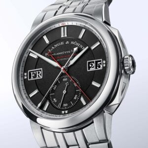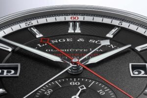 De kastafwerking is – zoals je van Lange mag verwachten – uitzonderlijk, met matte oppervlakken en afgeschuinde randen die doorlopen tot aan de nokken en schakels van de band. Een andere ingenieuze oplossing is om de functionaliteit van de knoppen aan de rechterkant te maximaliseren: als de kroon nu in de normale stand staat, bedienen de knoppen op 2 en 4 uur de chronograaf – starten, stoppen en resetten naar nul. Als de kroon wordt uitgetrokken, kunnen de datum en de dag van de week worden gecorrigeerd.