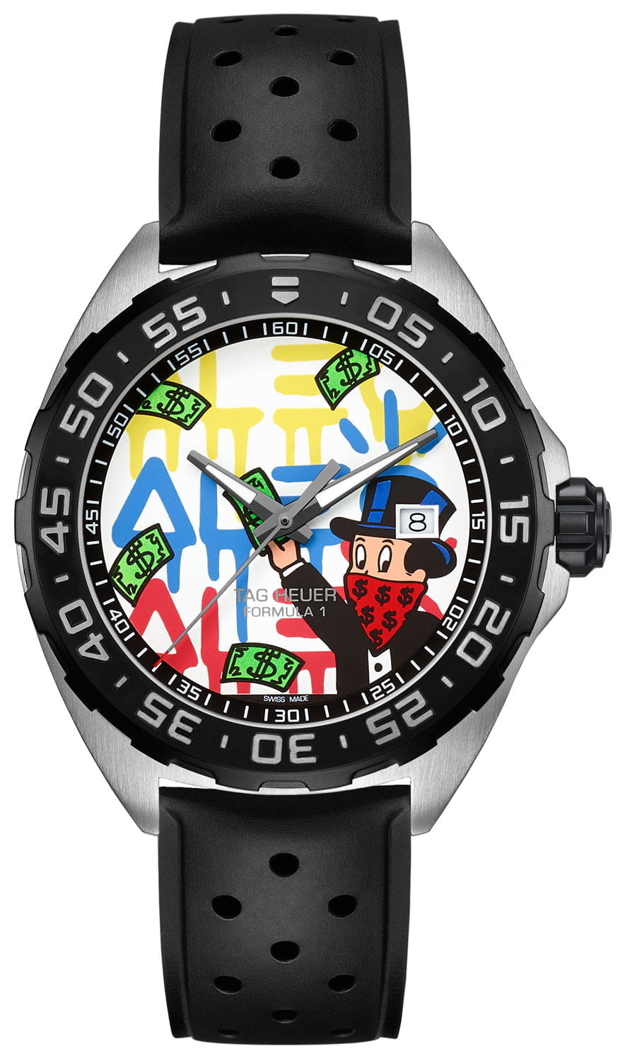 The first new model that received Alec Monopoly’s signature treatment is the Formula 1. Its distinct look has been celebrating TAG Heuer’s involvement in the most prestigious arena of motorsports for decades. Now its stainless steel case and black DLC bezel frame a dial that can only be a creation of Alec Monopoly. Transformed into the familiar character of the board game with the same name, he throws cash all around the dial against the backdrop of his signature.
