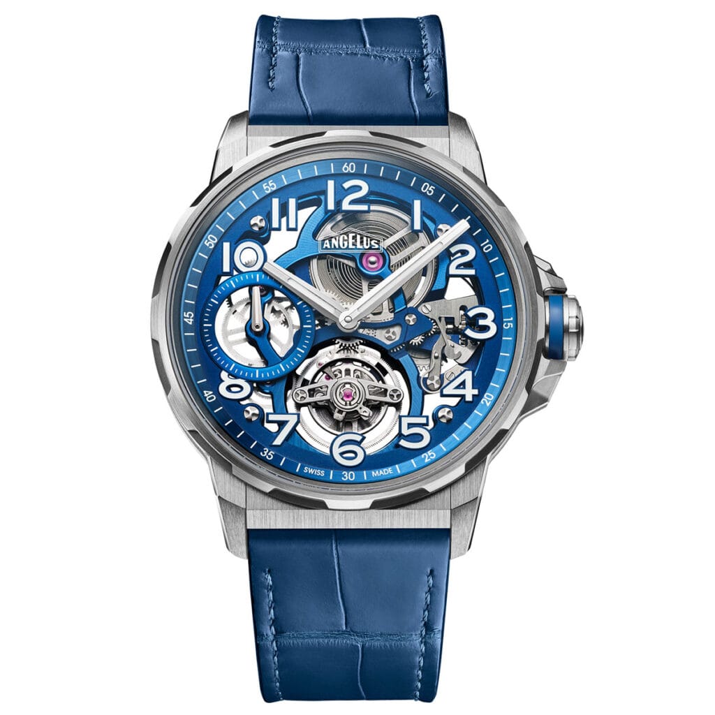 Met de Angelus Flying Tourbillon Titanium toont het merk aan ook sterk te zijn in ronde, opengewerkte modellen. Twee jaar na de lancering van de Chronodate is de collectie aangevuld met een vliegende tourbillon. In het 42,5 mm model stelen de kleur blauw en tal van sterke Angelus-kenmerken tot in detail de show.