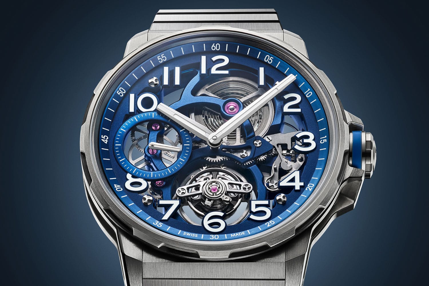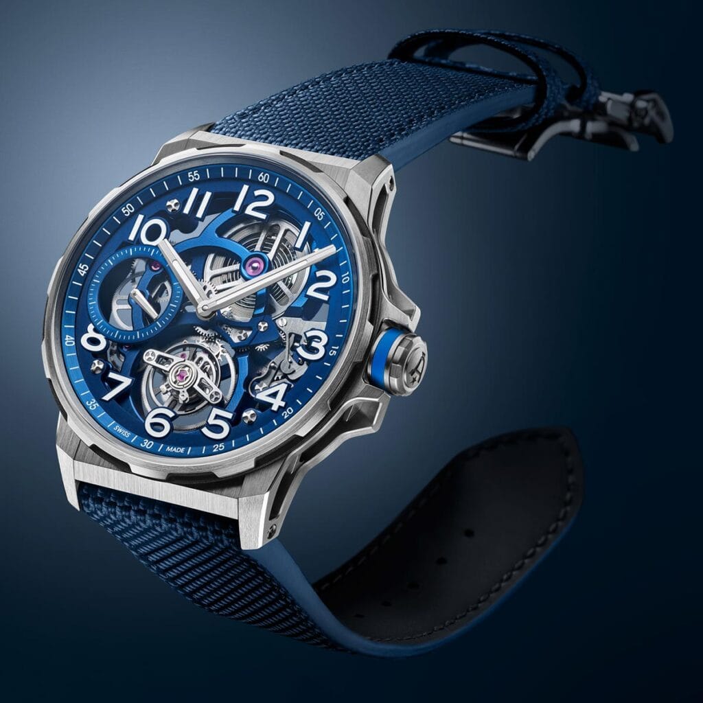 Het opengewerkte middendeel van de kast wordt breder richting de kroon, waarop het Angelus-logo prijkt. Het saffierglas wordt omlijst door een 12-kartelige bezel, terwijl de facetgeslepen lugs het verwisselbare bandensysteem vasthouden. Zowel de titanium schakelband als de matblauwe alligatorleren band van de Flying Tourbillon Titanium worden geleverd met een extra blauwe rubberen band.