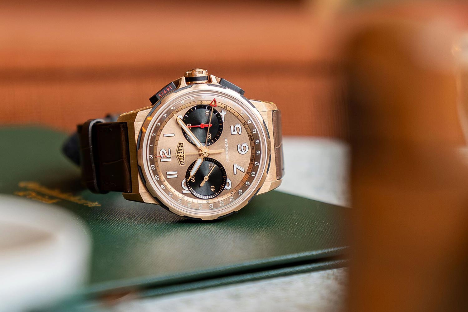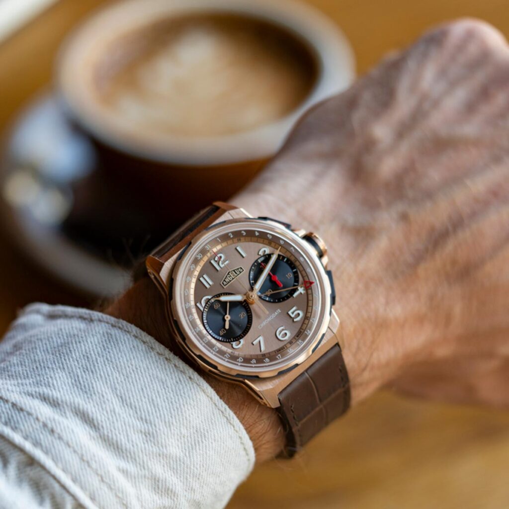 Angelus heeft deze Chronodate Moka-modellen uitgerust met zijn eigen Manufacture-chronograafuurwerk, het A-500-kaliber, dat de kleine seconde op 9 uur en een 30-minutenteller op 3 uur weergeeft. Een datumaanduiding met een wijzer loopt rond de omtrek van de wijzerplaat, zoals bij de beroemde originele Chronodate die in 1942 werd onthuld. De rode, opengewerkte pijlpunt geeft de kleur aan die is gekozen om de secundaire displays te sieren: de markeringen op de chronograafdrukknoppen, de punt van de direct aangedreven chronograafsecondewijzer en de wijzer op de 30-minutenteller zijn allemaal afgewerkt met rode lak.