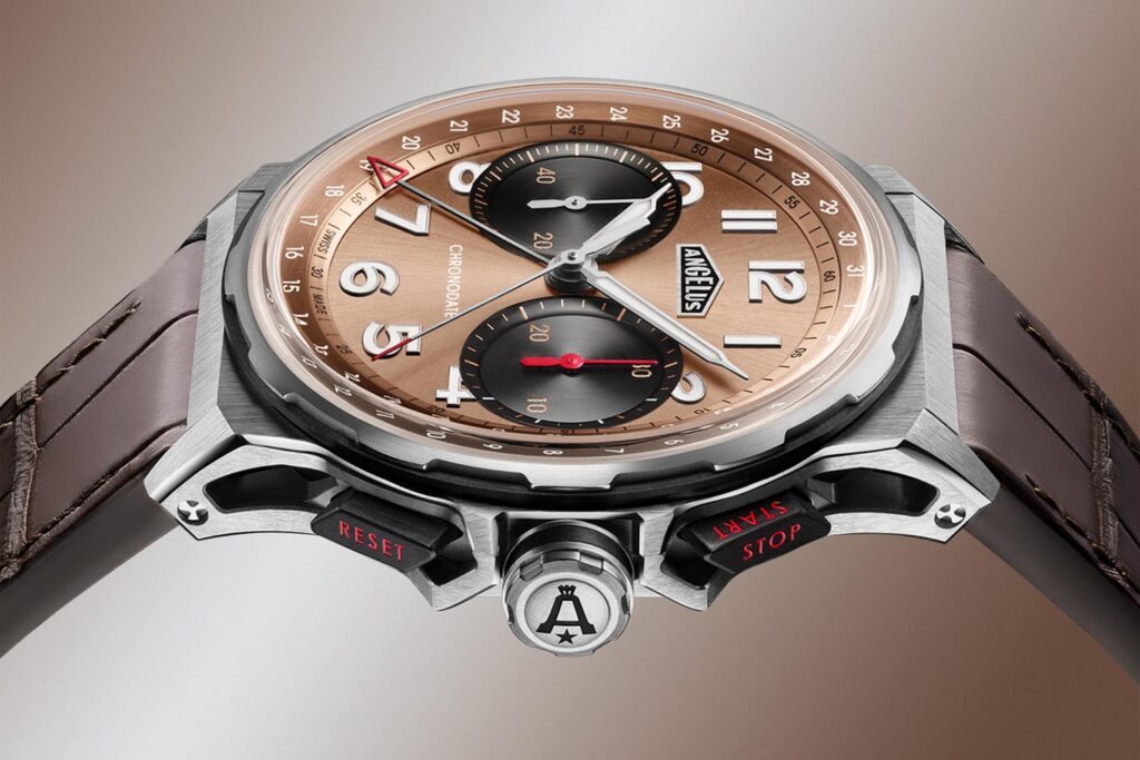 Beide stijlen zien we in de Chronodate Moka. Het model heeft een complexe kast van 42,5 mm die carboncomposiet combineert met roodgoud of titanium. Het uurwerk is ondergebracht in een container die is gefreesd uit een rigide maar lichtgewicht composiet op basis van koolstofvezel. De chronograafdrukknoppen, ook van carboncomposiet, zijn direct op deze kamer aangebracht. Rond deze container heeft Angelus een opengewerkte beugel ontworpen die het kastmidden en de bandaanzetten in één lijn verenigt. Dit geheel bevat ook een vaste lunette met twaalf inkepingen. Deze modulaire superstructuur maakt het mogelijk om één of meerdere materialen aan te bieden.