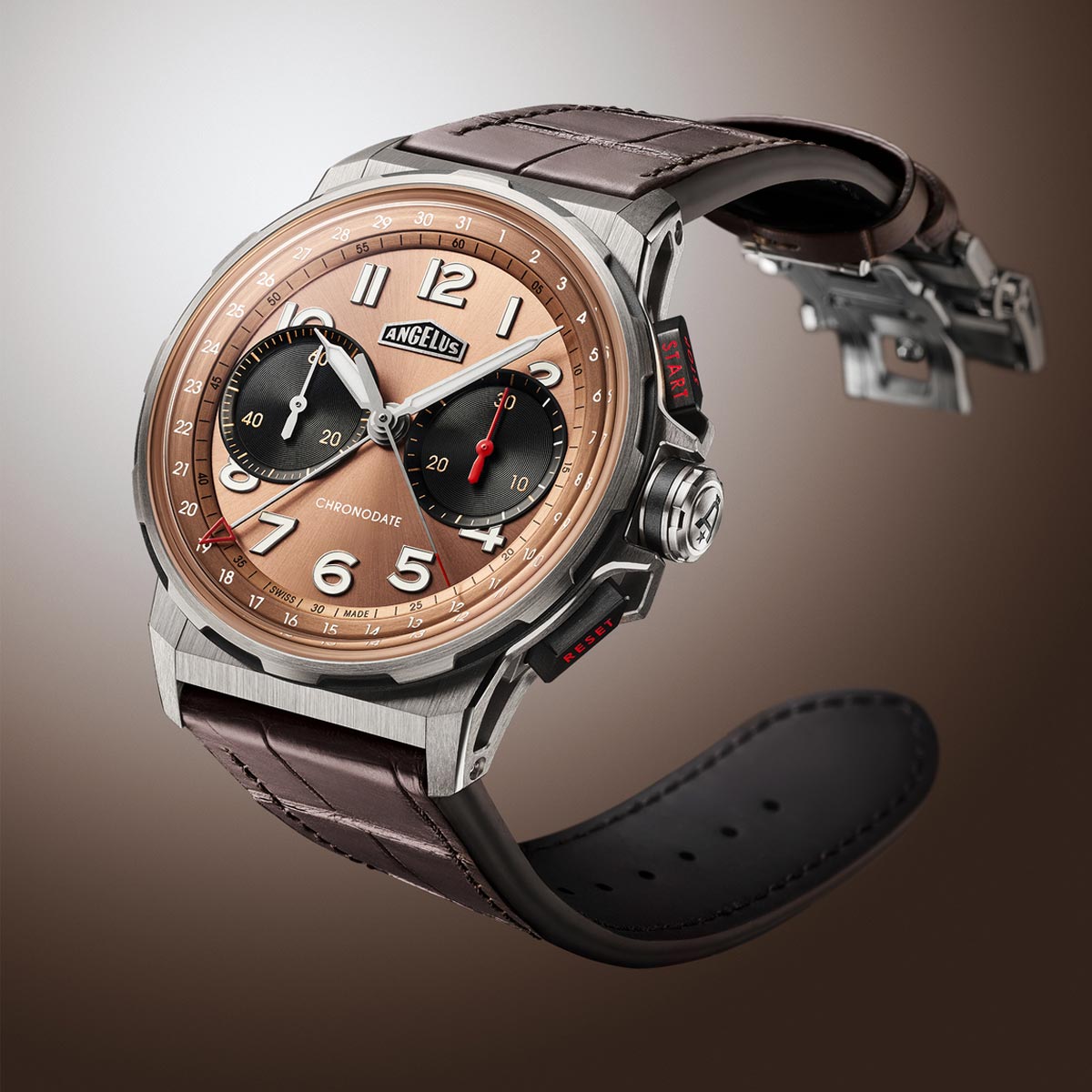 Beide stijlen zien we in de Chronodate Moka. Het model heeft een complexe kast van 42,5 mm die carboncomposiet combineert met roodgoud of titanium. Het uurwerk is ondergebracht in een container die is gefreesd uit een rigide maar lichtgewicht composiet op basis van koolstofvezel. De chronograafdrukknoppen, ook van carboncomposiet, zijn direct op deze kamer aangebracht. Rond deze container heeft Angelus een opengewerkte beugel ontworpen die het kastmidden en de bandaanzetten in één lijn verenigt. Dit geheel bevat ook een vaste lunette met twaalf inkepingen. Deze modulaire superstructuur maakt het mogelijk om één of meerdere materialen aan te bieden.