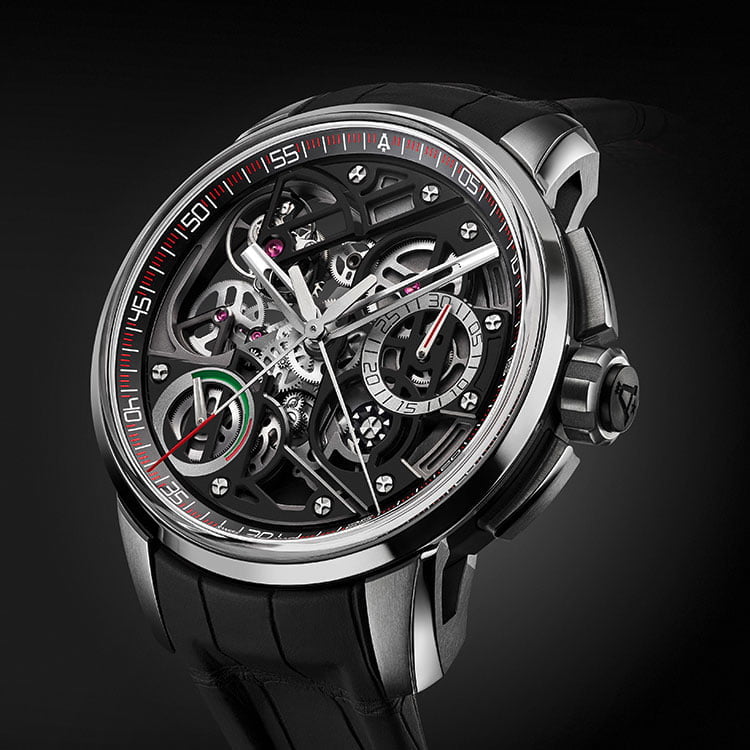 The movement hosts a number of complications – all fully integrated rather than modular add-ons – that are built on several layers, all visible thanks to the skeletonized bridges that create a form evoking the “A” of Angelus. To further increase the impression of depth, the movement is fully transparent around the tourbillon and treated in various shades of black and grey.