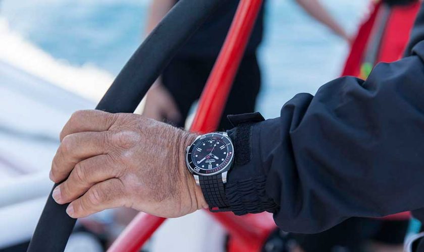 The new Nautilo Sailing Edition has the same red and black colour scheme as the yacht and comes with a black aluminium bezel and a cushion-shaped case made of steel with DLC coating. Rugged and able to withstand water and harsh conditions. Proof of this is delivered the day after the presentation when Lionel Péan and the SFS II leave the tower of Notre-Dame de la Garde behind and head straight for the open waters of the Mediterranean. The 70-foot yacht is at home here, and the Nautilo feels equally comfortable. The watch is a modern reinterpretation of the renowned Anonimo diver’s watches that were designed by military engineer Dino Zei. The most striking characteristic is the crown at 4 o’clock, which many divers feel is the ideal ergonomic position. The latest version of the 44.4mm Nautilo has an updated case design that is water resistant to 200m and the crown protector has been redesigned as well. The case back is made of hypoallergenic titanium and the bezel is unidirectional for safety, as we have come to expect in professional diver’s watches. The automatic Anonimo movement was made in Switzerland and is based on the Sellita SW 200-1 calibre. There is a choice of a rubber or NATO strap; both are sporty, functional and stylish.