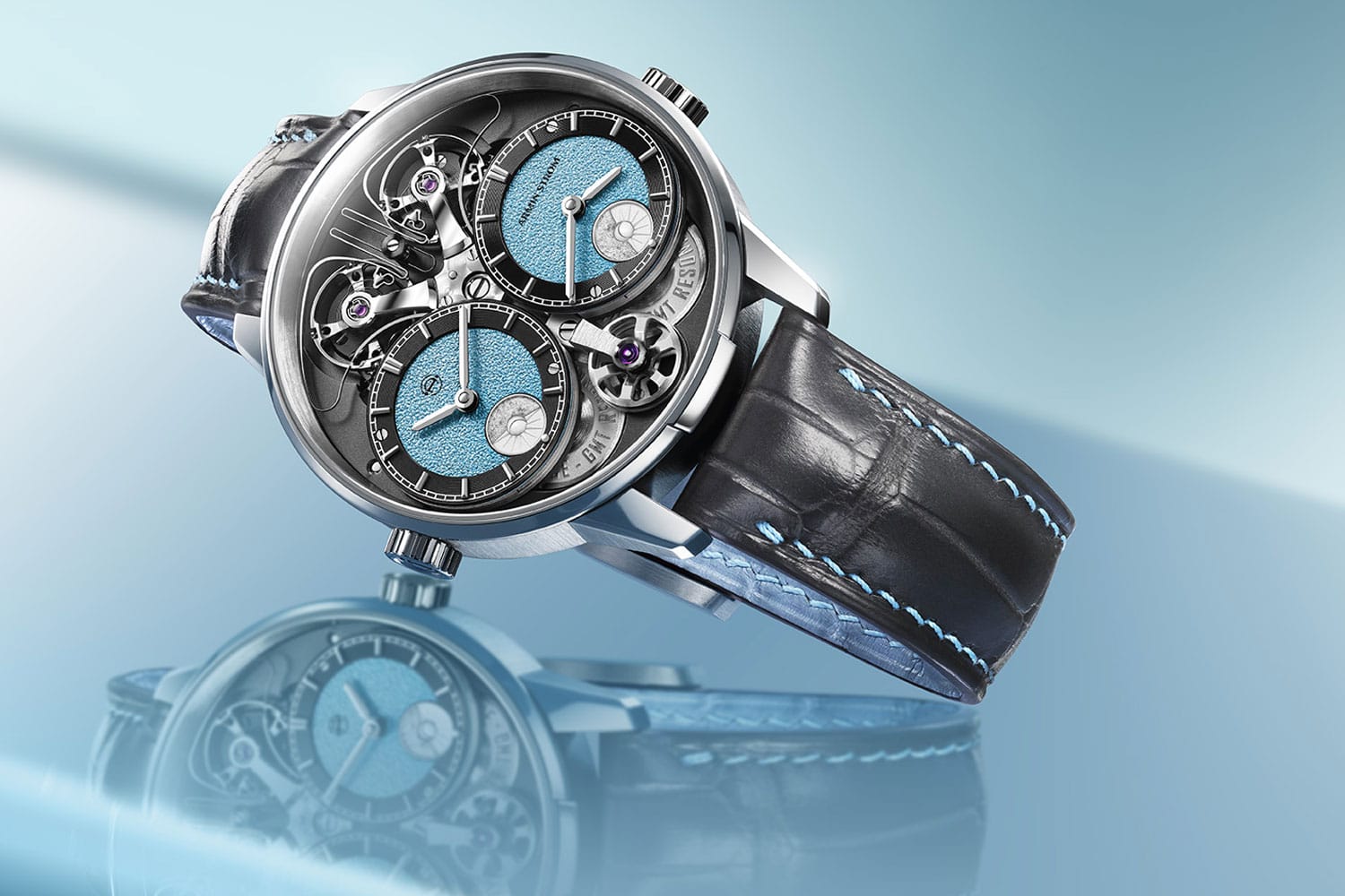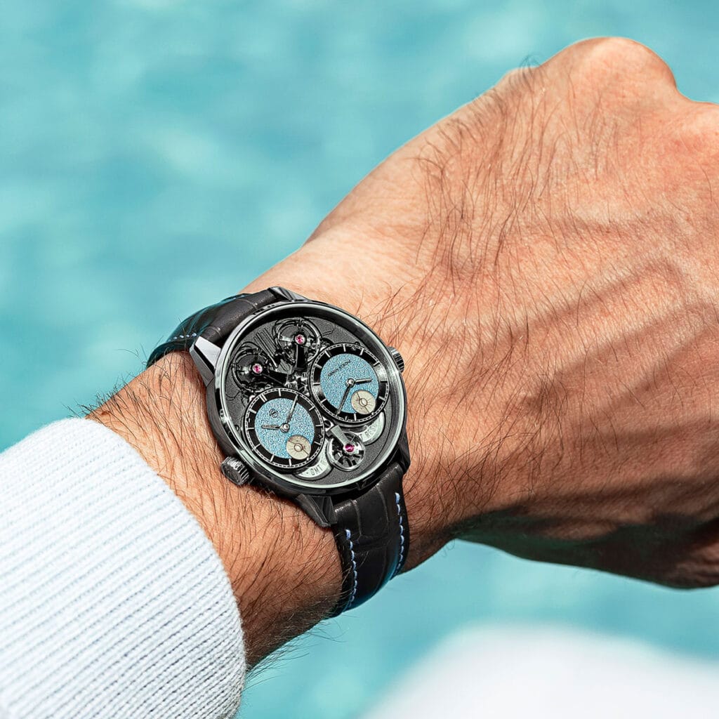 De wijzerplaat van de Dual Time GMT Resonance First edition is hemelsblauw met een verfijnde grenage afwerking. De zwarte ringen met gepolijste indexen harmoniëren mooi met de wijzers. De dag/nacht indicatoren, geplaatst op 24-uur wielen, versterken de luxe uitstraling. Voor het eerst is de dubbele balansbrug van het horloge vervaardigd uit gepolijst staal, wat een spiegelachtige, handgepolijste afwerking heeft en het vakmanschap benadrukt. Het kaliber is uitgebreid gedecoreerd met handgepolijste facetten, geschroefde details, cirkelvormige korrel, perlage en de iconische Genève-strepen. De mix van antraciet en zilverachtige tinten geeft het horloge visuele diepte en opvallende contrasten.