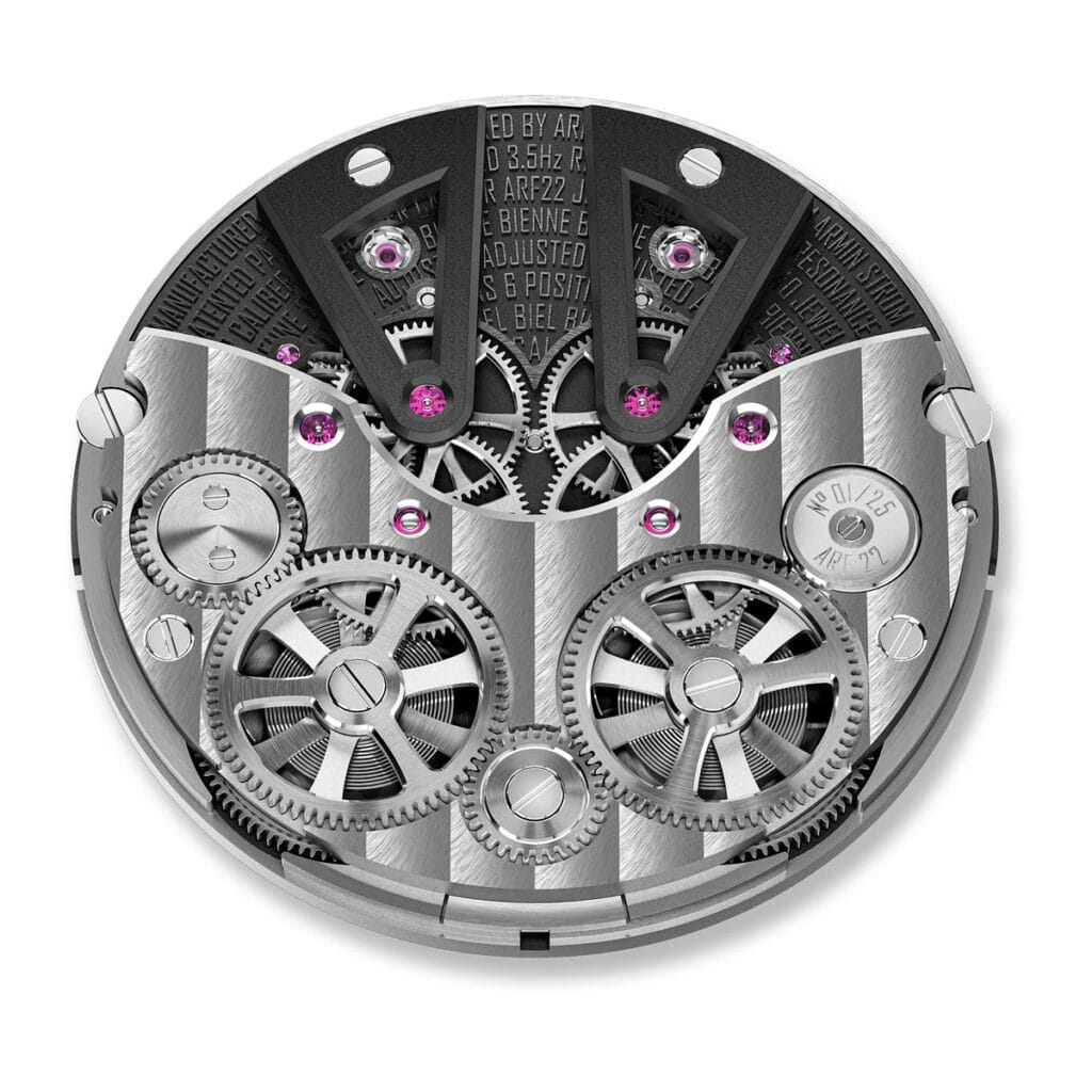 De Dual Time GMT Resonance First Edition wordt aangedreven door het nieuwe handgewonden Armin Strom kaliber ARF22. Dit is het 18e in-house ontwikkelde kaliber, gecreëerd onder leiding van mede-oprichter en meester-uurwerkmaker Claude Greisler. Het uurwerk heeft twee onafhankelijke, symmetrisch geplaatste oscillatoren die elkaar door resonantie synchroniseren. Twee aparte tandwieloverbrengingen regelen de onafhankelijke tijdsaanduidingen, aangevuld met een 24-uurs schijf met gegraveerde dag/nacht-indicatoren in de vorm van zon en maan. De achterzijde van de kast onthult de prachtige, symmetrische opbouw van het uurwerk. Daarnaast biedt het kaliber een unieke animatie op de wijzerplaat wanneer het horloge wordt opgewonden. Met twee kronen, geplaatst op 4 en 8 uur, kunnen de wijzerplaten onafhankelijk van elkaar worden ingesteld.