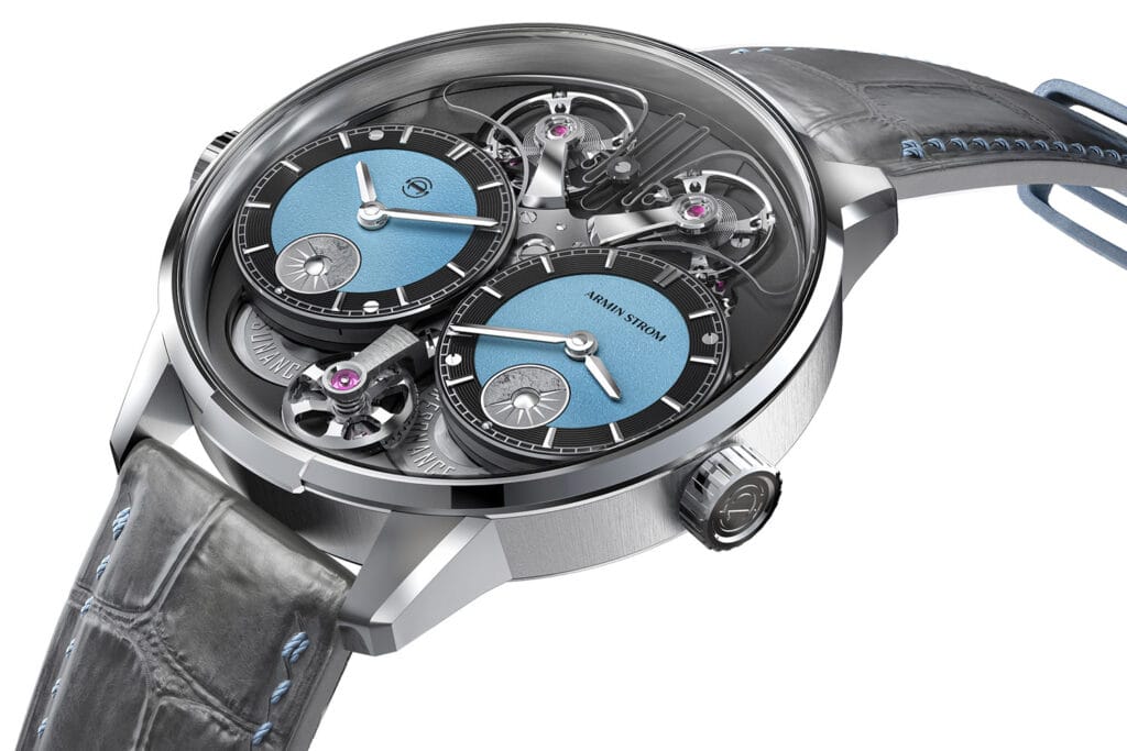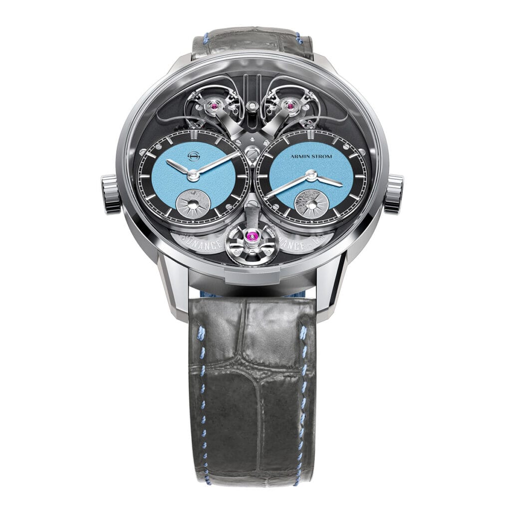 De Armin Strom Dual Time GMT Resonance wordt geleverd met twee luxueuze banden: een matte grijze alligator band met hemelsblauwe stiksels en een lichtgrijze alligator band met parelgrijze stiksels.