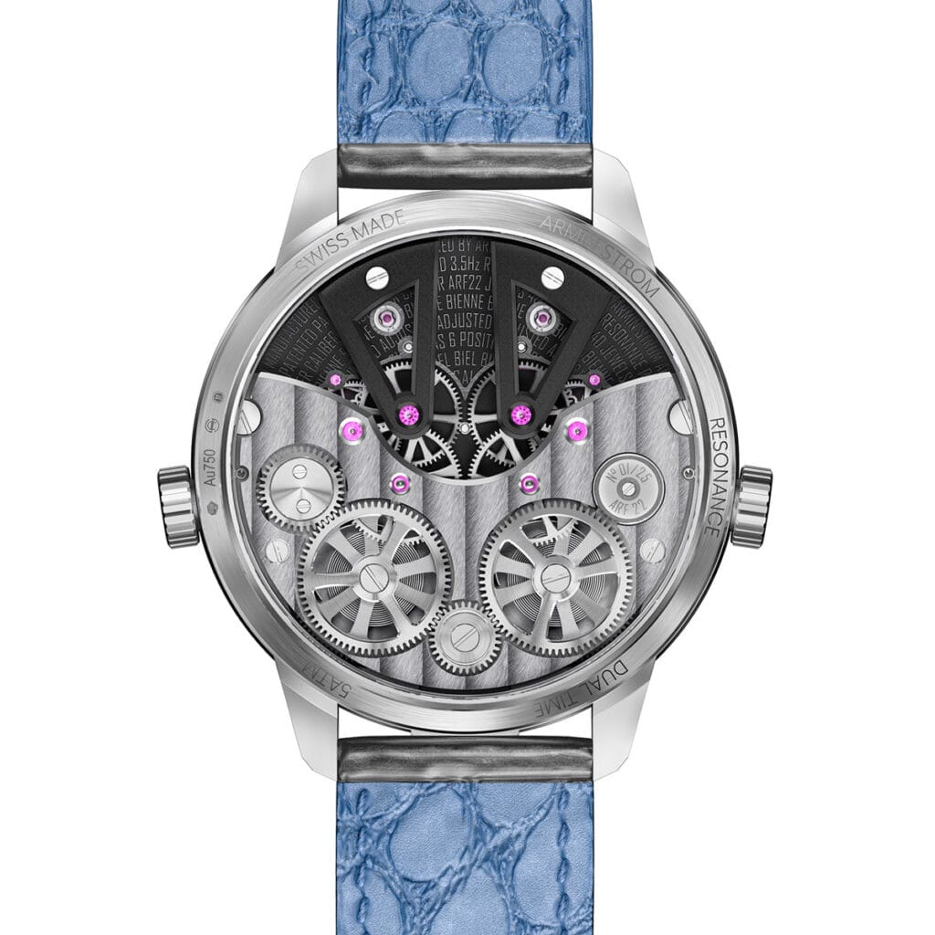 De Dual Time GMT Resonance First Edition is een vernieuwde versie van de iconische resonantie-complicatie van Armin Strom. Met de uitgave viert het Zwitserse horlogemerk het 15-jarig jubileum van de eigen Manufacture. Resonantie in horloges ontstaat wanneer twee uurwerken in één kast elkaar beïnvloeden door subtiele trilling uitwisseling tussen hun balanswielen. Deze synchronisatie zorgt ervoor dat de balanswielen elkaars bewegingen reguleren, waardoor invloeden van zwaartekracht en polsbewegingen op de tijdmeting tot een minimum worden beperkt. Dit resulteert in een constant nauwkeurige tijdsweergave.