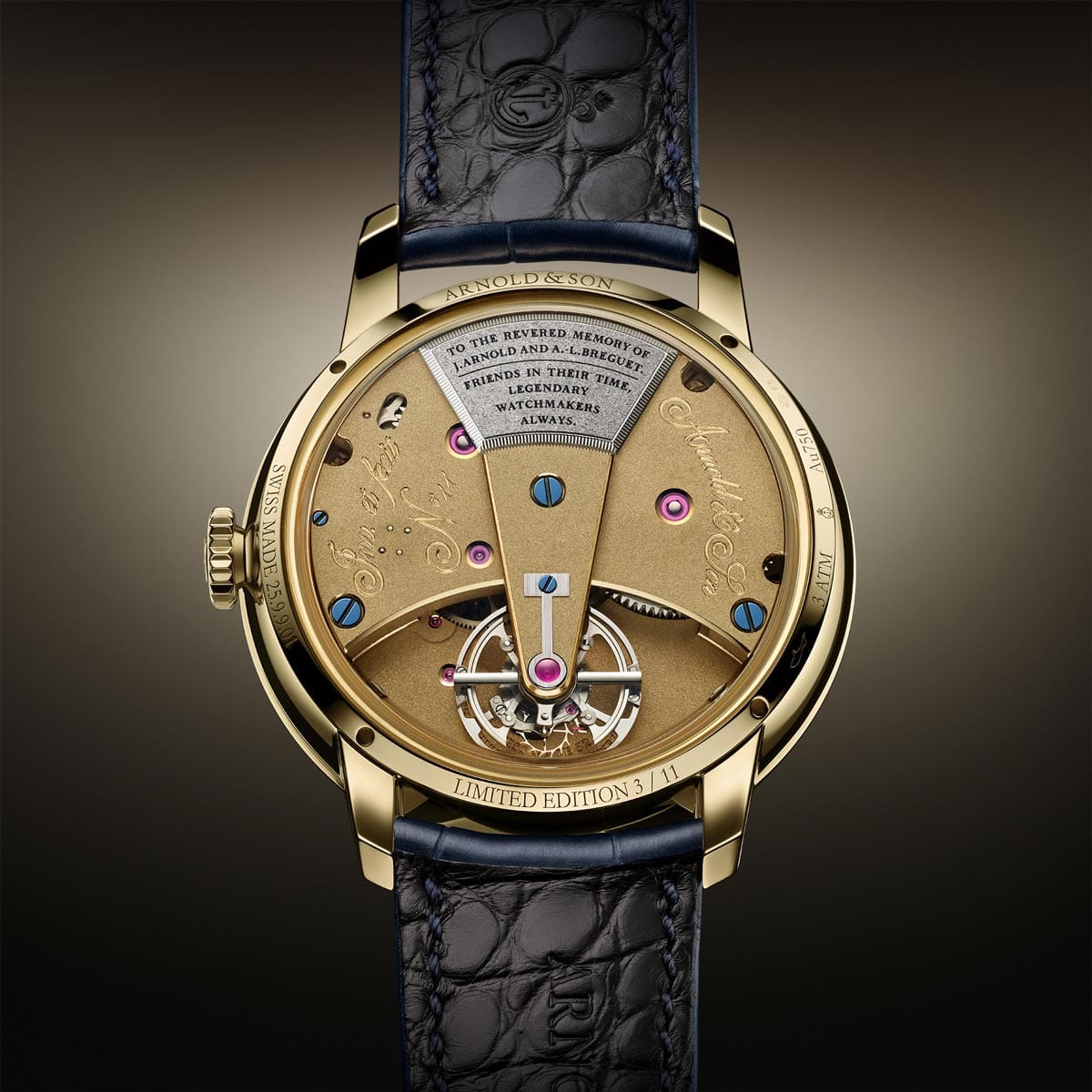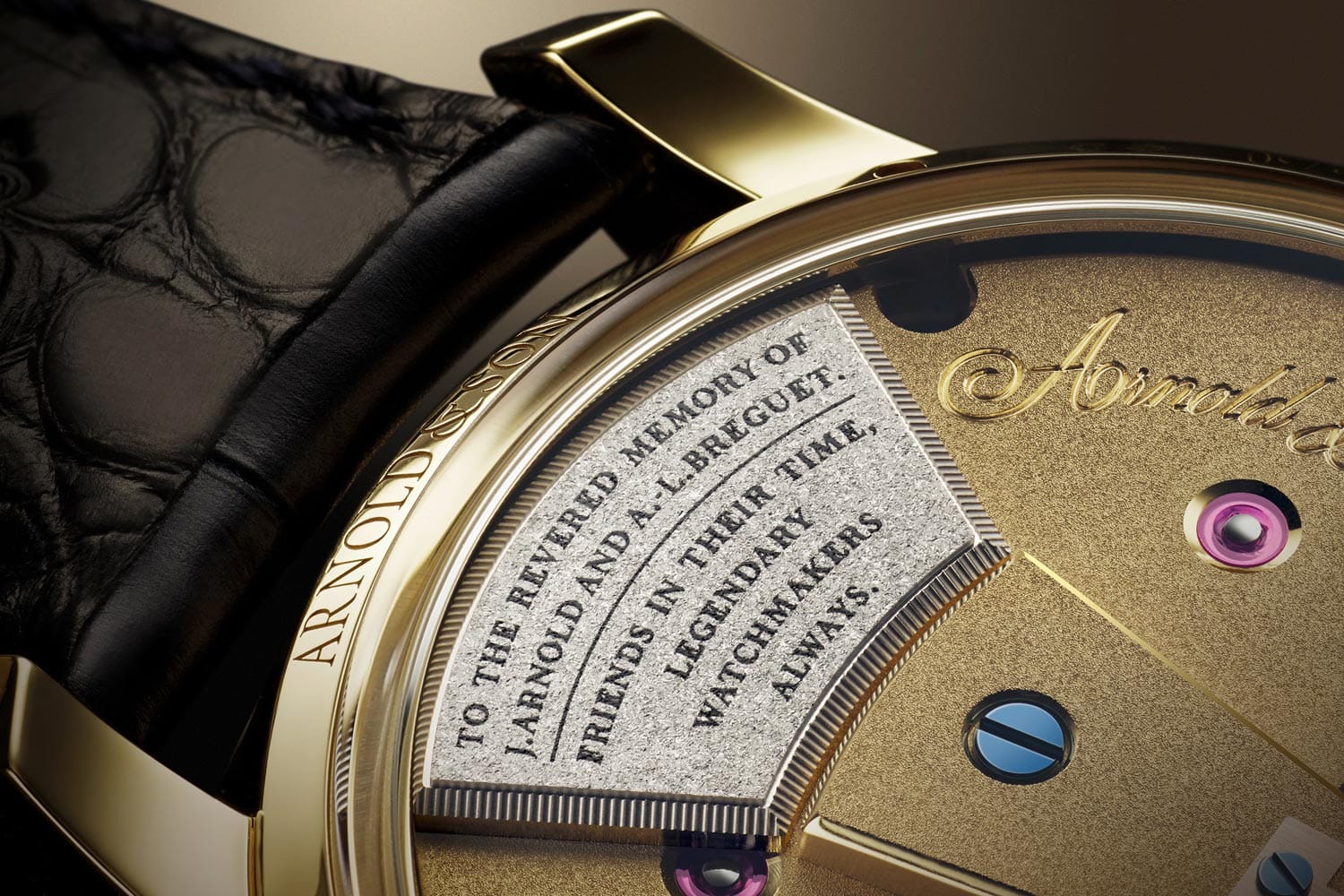In de 18e eeuw waren grote horlogemakers als Arnold en Breguet vaak bevriend, ondanks taalbarrières en politieke obstakels. De vriendschap tussen deze twee pioniers van de tijdwaarneming was ongekend sterk en bleef standhouden, zelfs in de turbulente tijden van oorlog en de Franse Revolutie. Gedurende de frequente bezoeken van Breguet aan Londen tussen 1789 en 1791, deelden de twee horlogemakers hun inzichten en kennis van de tijdwaarneming, waardoor ze de wetenschap van de horlogerie naar een nieuw niveau tilde. Ter nagedachtenis aan deze vriendschap en hun gezamenlijke onderzoeksinspanningen, baseerde Breguet zijn eerste tourbillon-regulator op de marinechronometer nr. 11 van John Arnold, en liet hij een zilveren plaat op de brug graveren met de boodschap: “De eerste tourbillon-regulator van Breguet, geïnstalleerd in een van Arnold’s eerste werken. Breguet’s hommage aan de vereerde herinnering van Arnold. Gepresenteerd aan zijn zoon in 1808.”