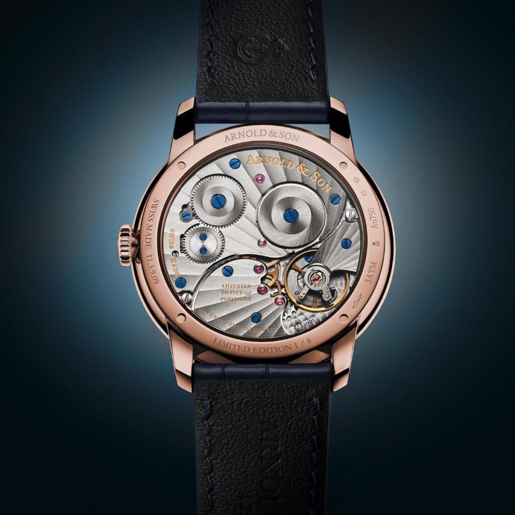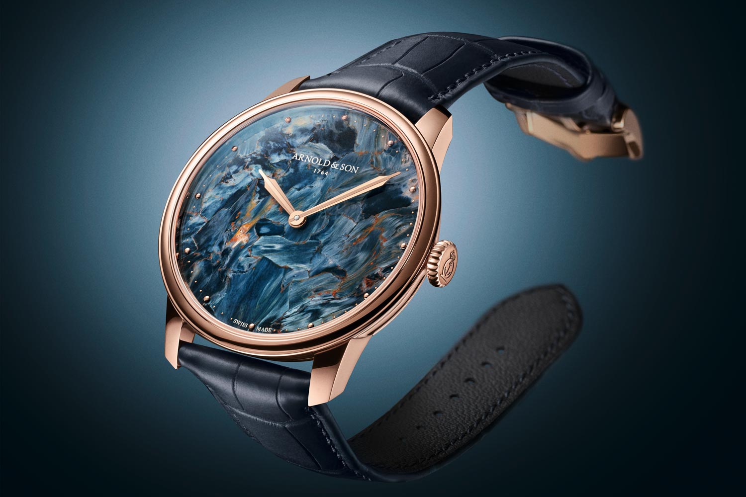 Pietersiet is een zeldzame steensoort met een gelaagde structuur. Door de natuurlijke variatie is iedere wijzerplaat uniek. Pietersiet wordt ook wel ‘de steen der stormen’ genoemd. Dit decoratieve mineraal is een steensoort op basis van chalcedoon. Het werd begin jaren zestig ontdekt door Sid Pieters in Namibië. Arnold & Son koos pietersiet vanwege de subtiele en gelaagde structuur, waarbij elke wijzerplaat een eigen karakter krijgt. De combinatie met de weergave van enkel uren en minuten zorgt voor een rustig en overzichtelijk geheel, waarbij de focus volledig op het materiaal ligt.