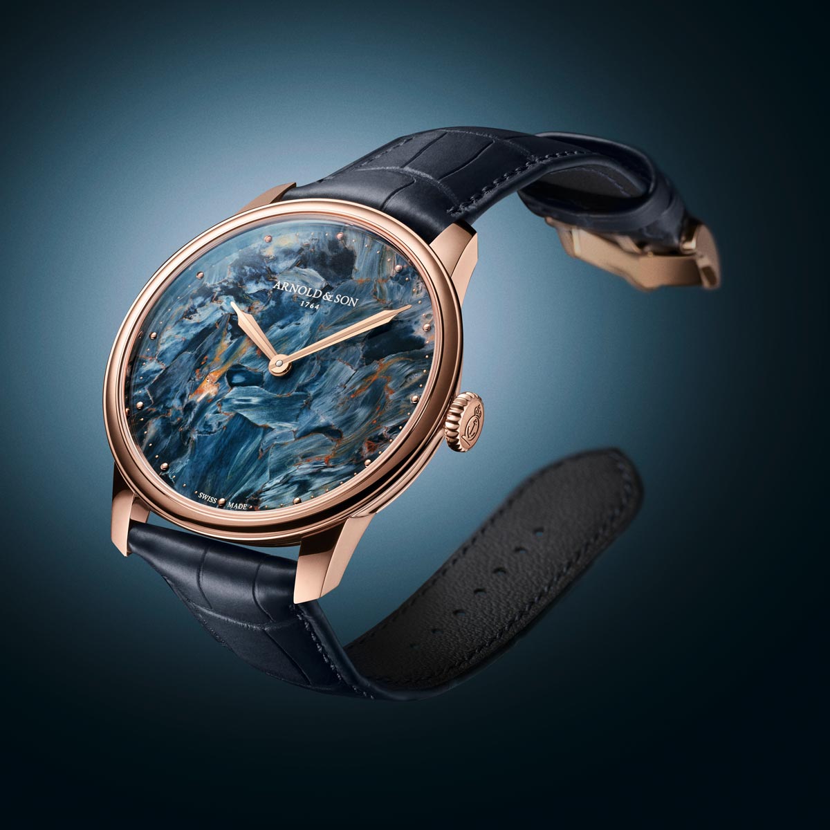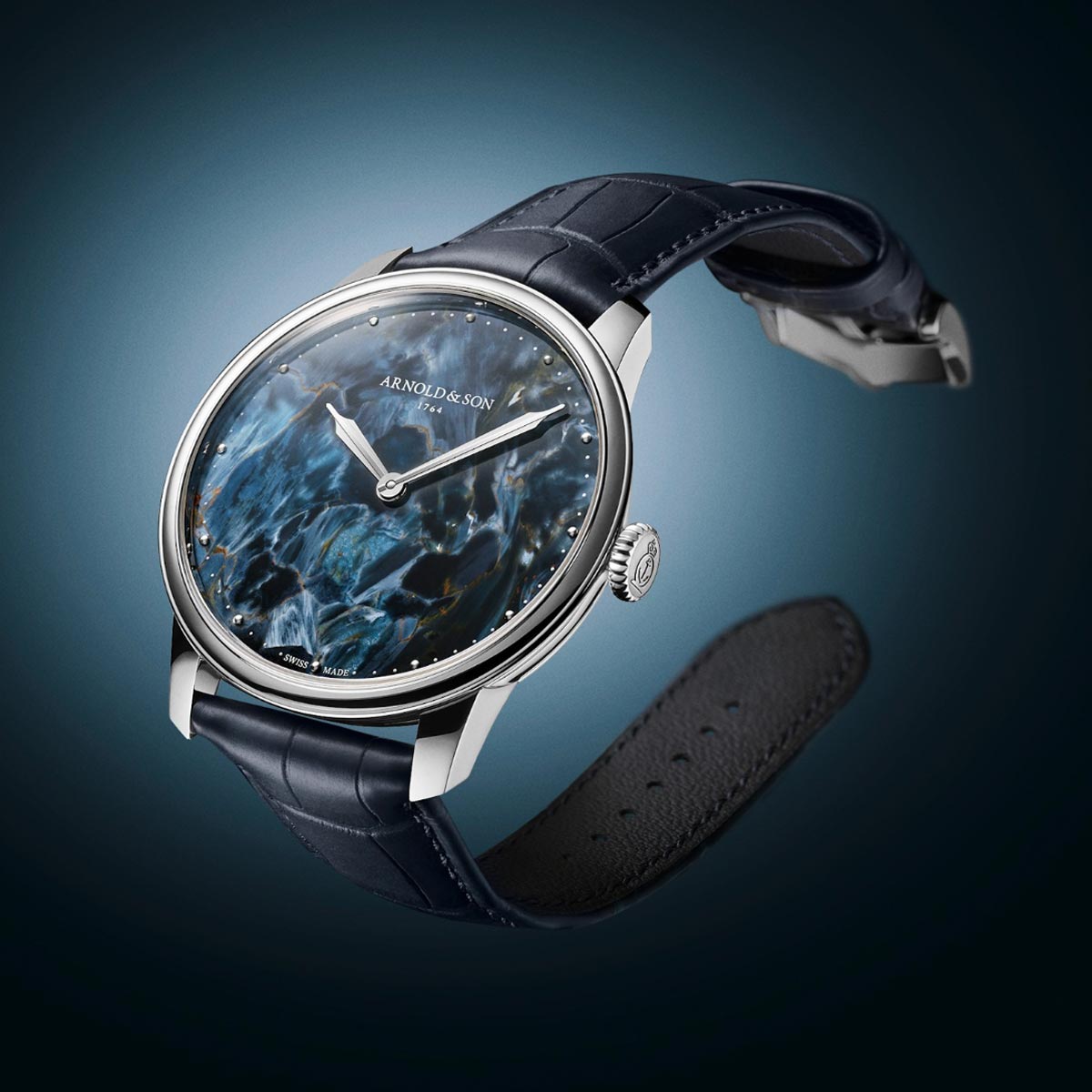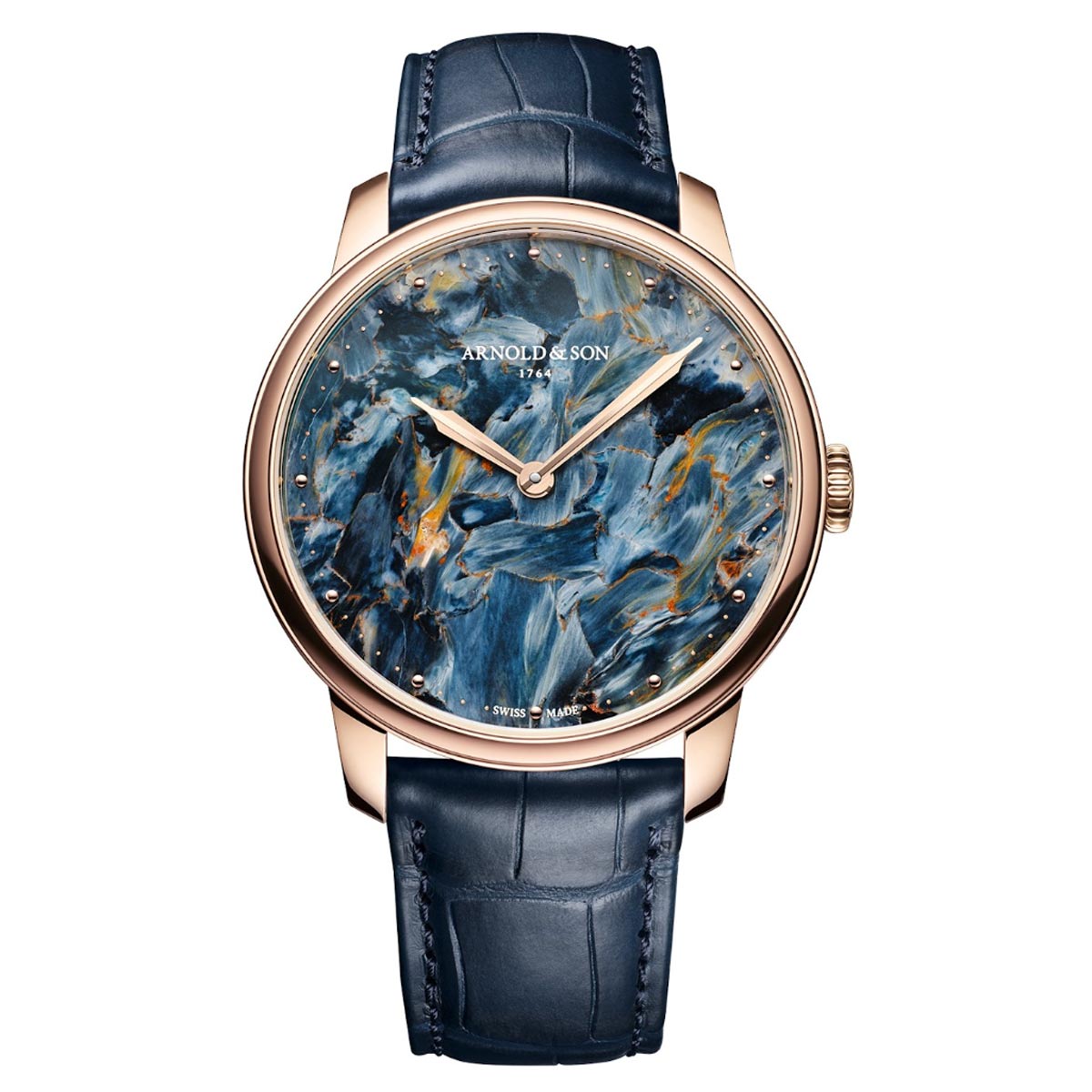 Pietersiet is een zeldzame steensoort met een gelaagde structuur. Door de natuurlijke variatie is iedere wijzerplaat uniek. Pietersiet wordt ook wel ‘de steen der stormen’ genoemd. Dit decoratieve mineraal is een steensoort op basis van chalcedoon. Het werd begin jaren zestig ontdekt door Sid Pieters in Namibië. Arnold & Son koos pietersiet vanwege de subtiele en gelaagde structuur, waarbij elke wijzerplaat een eigen karakter krijgt. De combinatie met de weergave van enkel uren en minuten zorgt voor een rustig en overzichtelijk geheel, waarbij de focus volledig op het materiaal ligt.