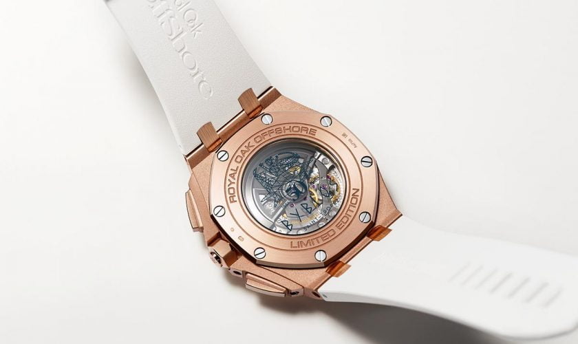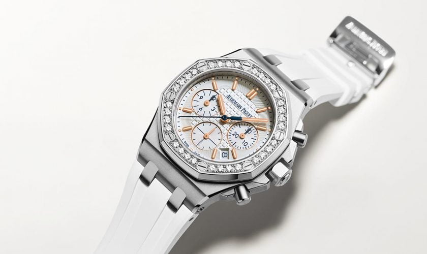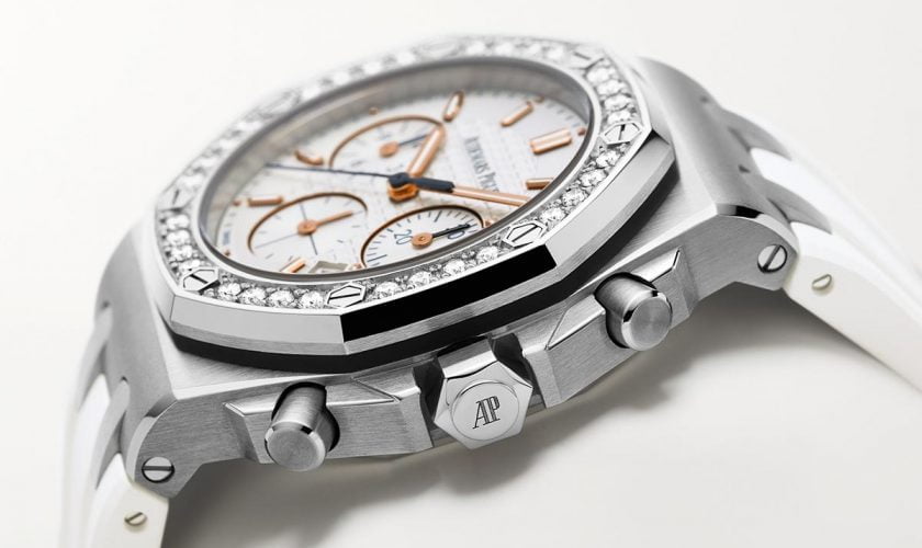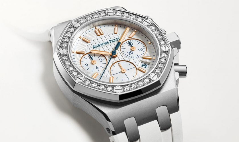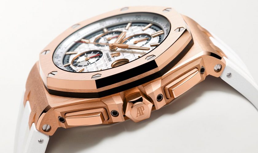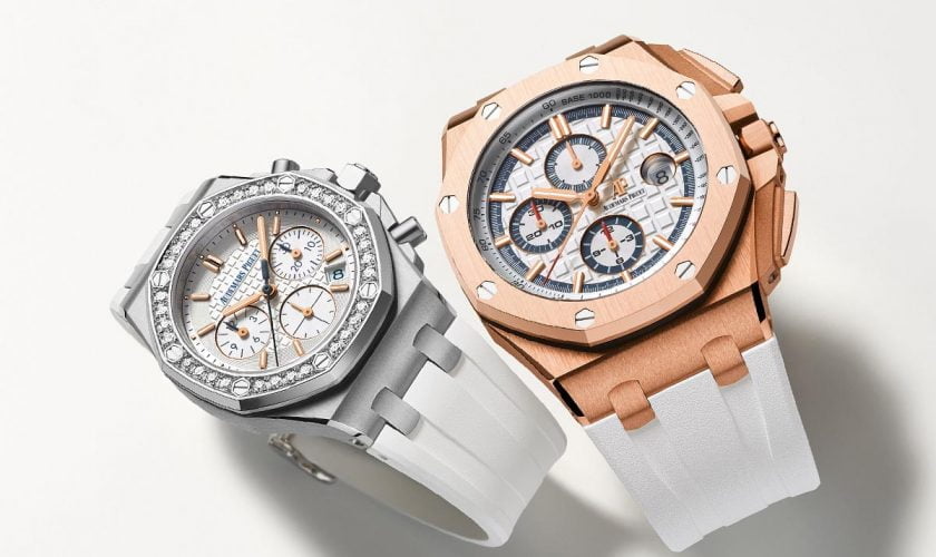 The women’s piece is waterproof to 50 meters with a stainless steel case, screw-locked crown and pushpieces, a silver dial with “Lady Tapisserie” motif and luminescent coating on rose gold hands. The bezel is set with 32 brilliant cut diamonds, for a total of 1.02 carats. Meanwhile, the “his” version is an 18-carat pink gold Royal Oak Offshore Chronograph featuring blue transfers as well as pink gold hands and hour markers on a “Mega Tapisserie” dial. The men’s model is waterproof to 100 meters. To highlight this half-a-century anniversary, the caseback of both Royal Oak Offshore Summer Editions are engraved with the hotel’s anniversary dates and its coat of arms depicting the abduction of Europa by Zeus.