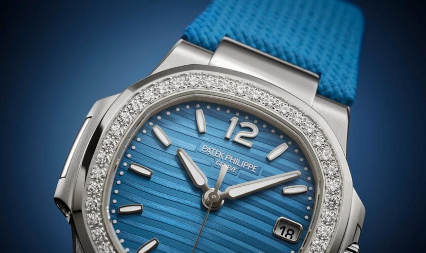 Exquise details en schitterende diamanten De Nautilus dames is een prachtig vervaardigd dameshorloge dat stijl en luxe moeiteloos combineert. De lakblauwe wijzerplaat valt direct op door het subtiele “golf” patroon, dat een dynamisch en maritiem karakter geeft. De uurcijfers en markers, vervaardigd uit witgoud en voorzien van een witte luminiscerende