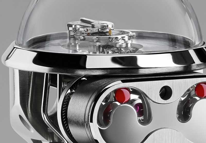 When you turn Balthazar’s torso 180 degrees you find out that he is a robot with two faces. He exchanges his friendly face for a death’s head and shows a double moon phase indicator that is accurate for the next 122 years. A minor side note with the happy face of Balthazar: his red eyes keep a close watch on his surroundings and also serve as the 20-second retrograde indicator. It’s a signal that something sinister is hiding in the brain of Balthazar. At first glance that brain, in the form of the regulating mechanism with Incabloc shock absorption system, appears to be completely in order. It’s open and exposed under the sapphire top of the skull and can be admired freely. However, the ruby-red, bloodthirsty look in Balthazar’s articulating eyes makes one suspect otherwise. Balthazar’s price will be on application and the clock will be built in a limited edition of 50 pieces with black, silver, blue and red details. In other words, an army of 200 schizophrenic robots to help out Melchior and Sherman. Max Büsser obviously has devious intentions to conquer the world step by step.