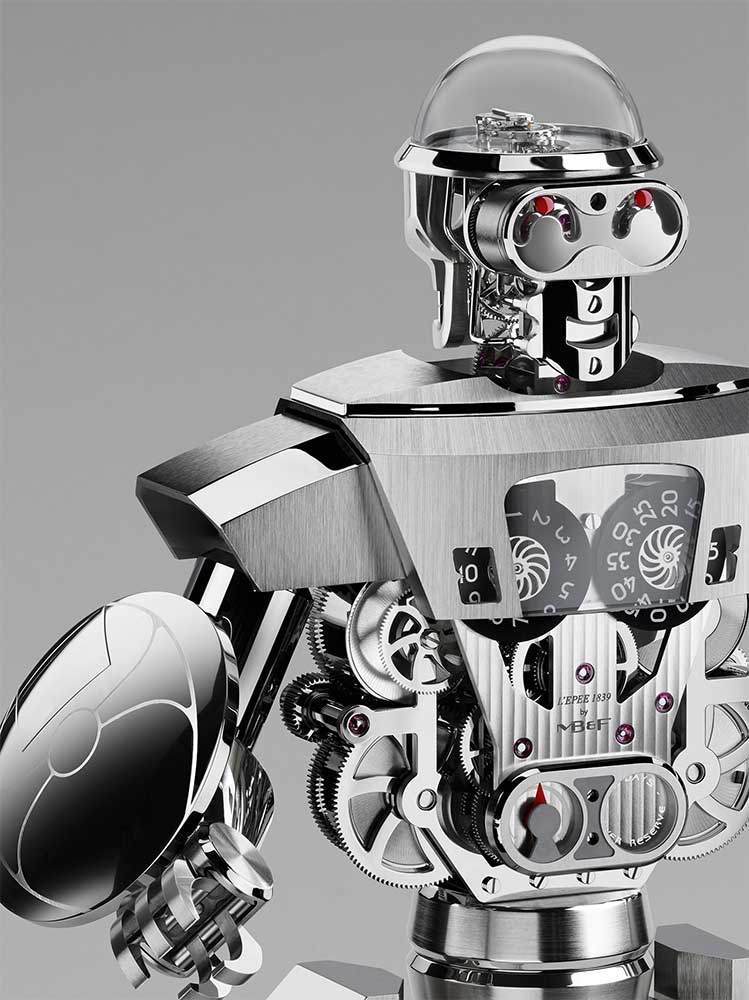 Balthazar is the third robot that MB&F, in conjunction with L’Epée, is unleashing on the world. After Melchior and Sherman (the robot that rode on the chassis of a tank) we now have a creation consisting of 618 components that is able to deliver jumping hours, retrograde seconds and a 35-day power reserve – and is wound with the key that is hidden in its shield. With its height of 40cm and weight of 8kg Balthazar is an imposing figure.