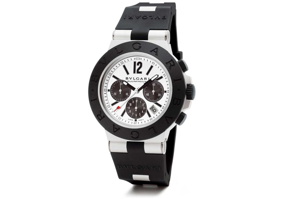 De Diagono-collectie van Bulgari bestaat uit een reeks sportieve horloges met een kenmerkend design. Binnen de serie wordt niet alleen gevarieerd met diverse afmetingen en complicaties. Maar ook met verschillende materialen. Zo is de Diagono Aluminium voorzien van een 32 millimeter grote kast van aluminium en titanium met een vaste rubberen bezel. De kroon is van titanium en deze heeft een zwarte pvd-coating. Daarnaast is het horloge verder voorzien van een zwarte band in gevulkaniseerd rubber met aluminium accenten. De witte wijzerplaat vormt een mooi lichtpunt in het geheel en is voorzien van drie subdials en een datumaanduiding.