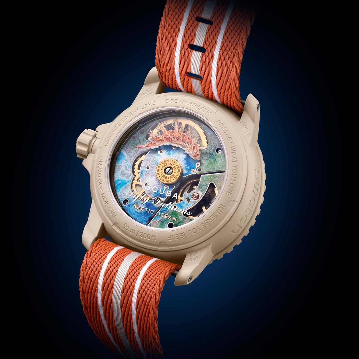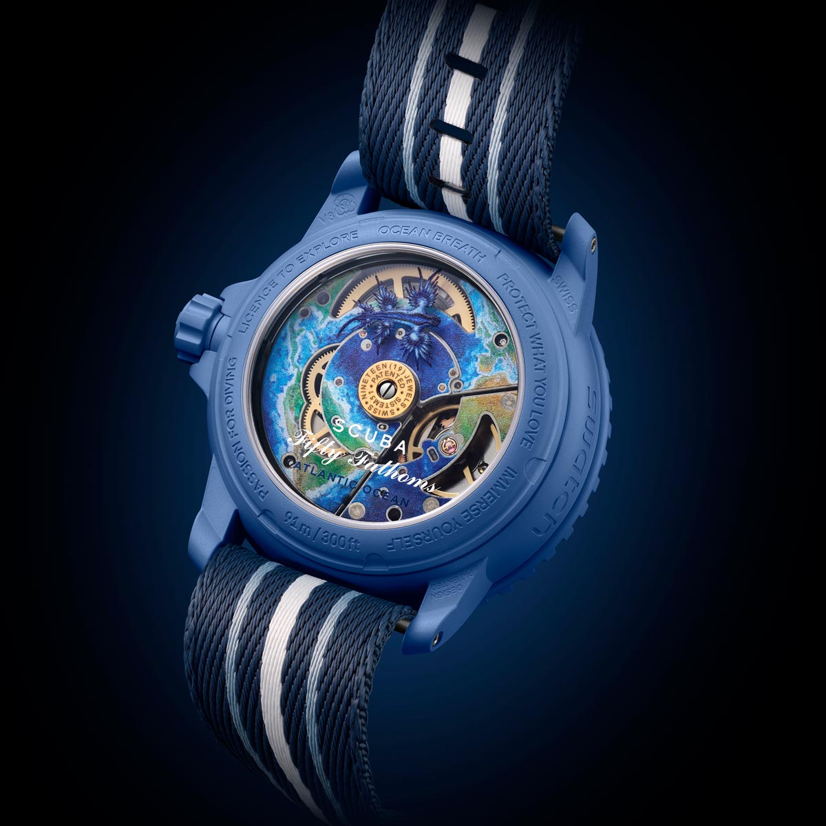 Anders dan bij modellen van Blancpain is de Bioceramic Scuba Fifty Fathoms uitgerust met het mechanisch Swatch-uurwerk SISTEM51. Het uurwerk met een gangreserve van 90 uur, heeft slechts 51 onderdelen. Het is anti-magnetisch dankzij een Nivachron™- veer. Tien jaar geleden, in 2013 zorgde de SISTEM51 voor een kleine revolutie in de wereld van automatische horloges dankzij een voorkant die de tijd vertelt, en een achterkant die een verhaal vertelt. In overeenstemming met dit idee is de achterkant van alle vijf de horloges voorzien van een illustratie van een kleurrijk oceaandier. De NATO-horlogebanden, in een overeenkomstige kleur met de kast, zijn gemaakt van gerecyclede visnetten die zijn opgevist van de oceaanbodem.