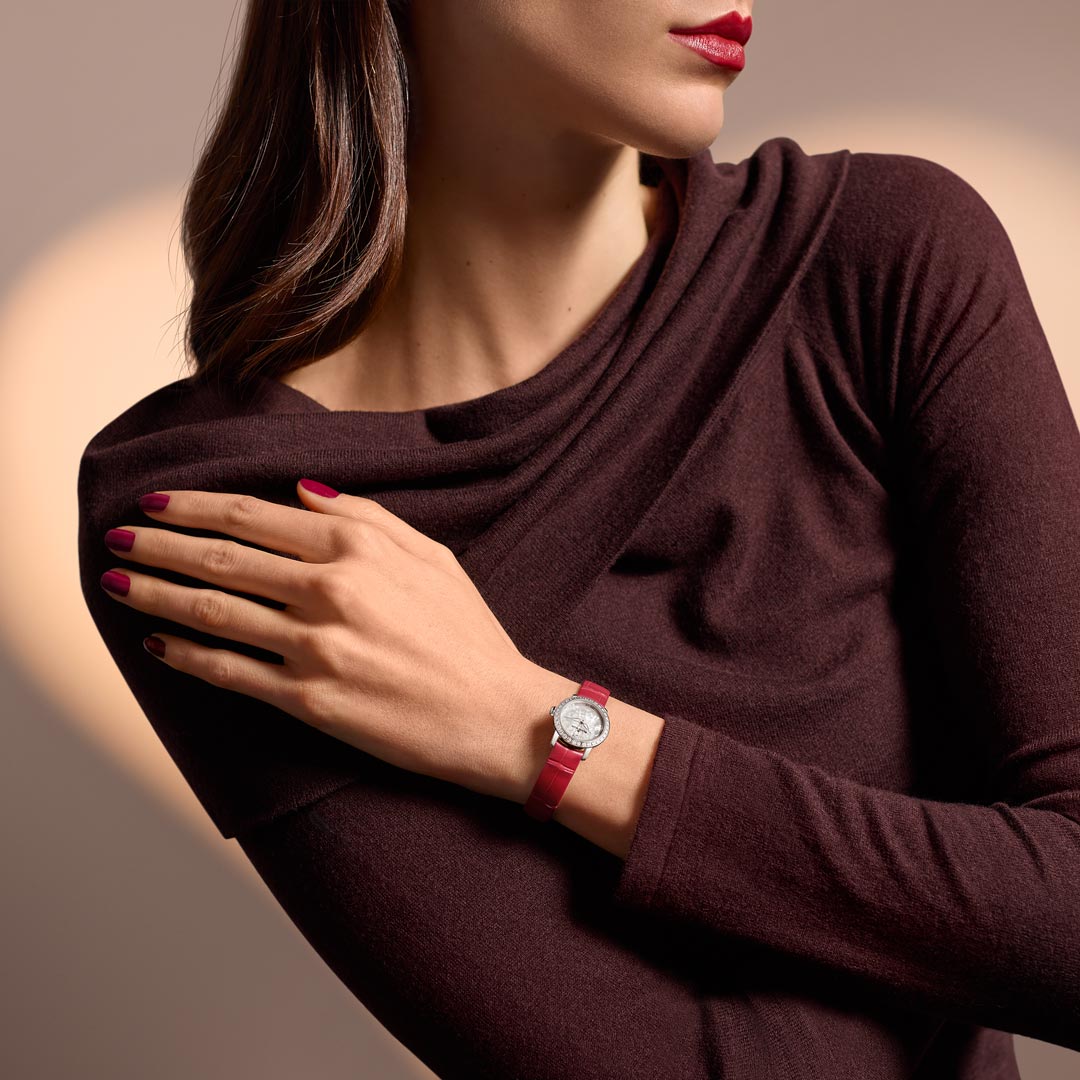 Diamanten details en een subtiel hartvormig accent zorgen voor een poëtische finishing touch, terwijl de dieprode Chérie-band het geheel een intieme en vrouwelijke uitstraling geeft. Elk detail is met zorg gekozen en uitgevoerd.
