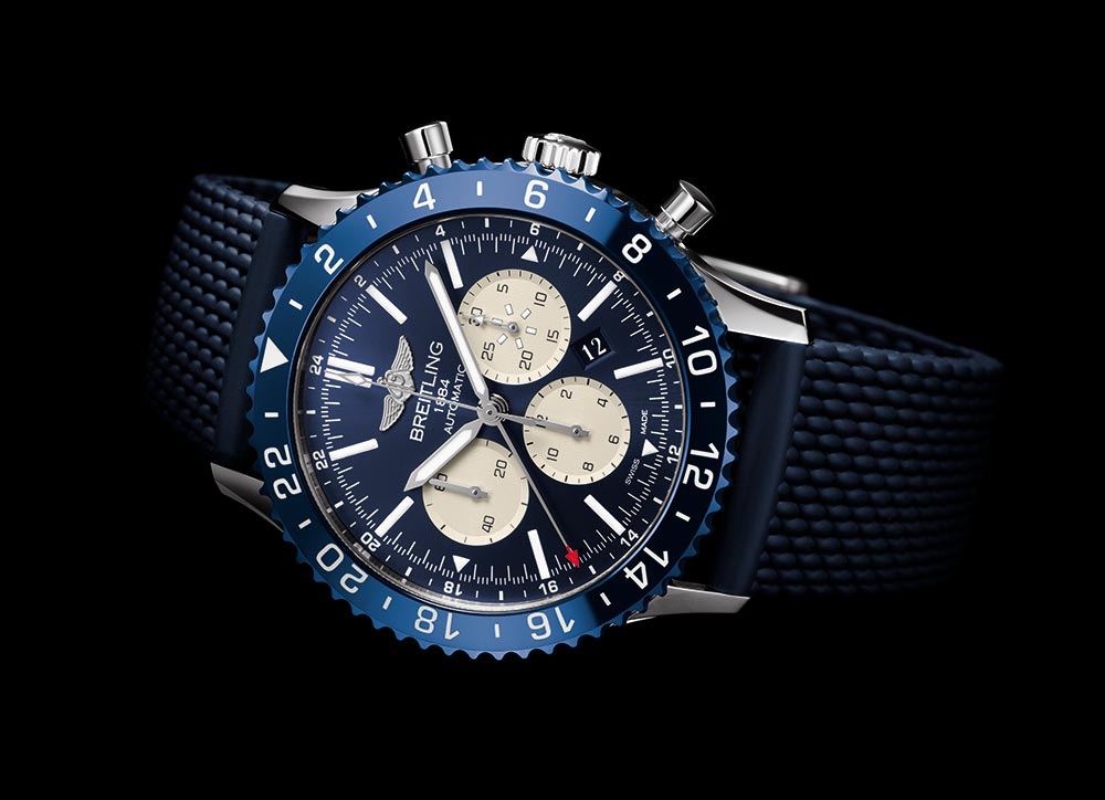 Movement: Manufacture Breitling Caliber B04 • officially chronometer-certified by the COSC, selfwinding, high-frequency (28,800 vibrations/hour) • 47 jewels. More than 70-hour power reserve • 2nd timezone in 24-hour mode on the dial •3rd timezone on the bezel • 1/4th of a second chronograph • 30-minute and 12-hour totalizers • Calendar. Case: steel with ceramic bezel (100-piece limited series) • Water-resistant to 100 m (330 ft) • Bidirectional rotating bezel • Cambered sapphire crystal, glareproofed on both sides • Diameter: 46 mm. Dial: Aurora blue. Strap/Bracelet: rubber Aero Classic/Ocean Classic.