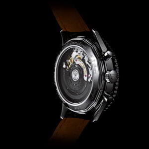 Alongside the flagship model with its black dial and silver counters, it also regularly adopts new and distinctive faces, such as that of the new Navitimer 01 Limited Edition. This exclusive instrument issued in a 1000-piece series is distinguished by its dark gray dial featuring a sunburst brushed finish that subtly offsets the black counters. The result is an original, technical and eminently masculine look enhanced by indications made using the “par épargne” technique against a pure silver backdrop. While the dial side with its famous circular aviation slide rule reflects Breitling’s privileged ties with the aeronautical world, the caseback provides a window onto another of the brand’s stronghold that explains its success among aviators: impressive mastery of mechanical chronograph movements.