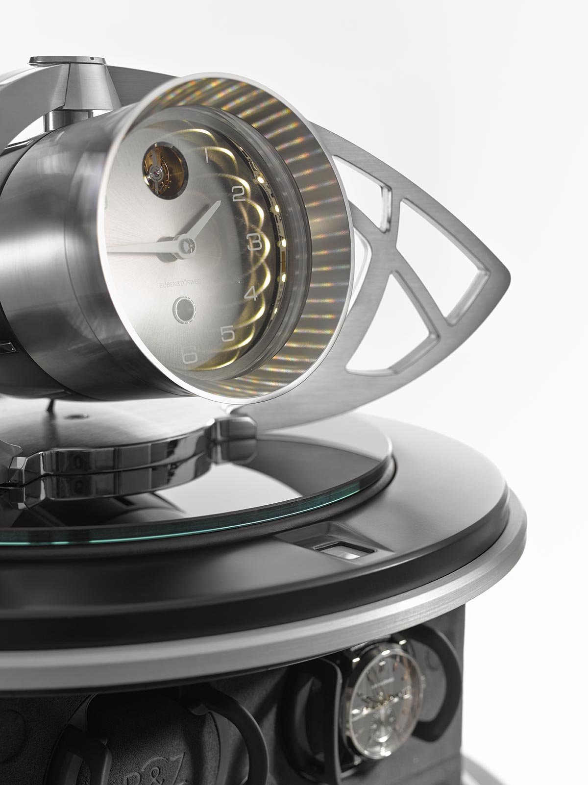 It was the new Grande Illusion that attracted everybody’s attention. The Grande Illusion showcased all the possibilities of this creative concept when one gives free rein to the Buben & Zorweg design team. Almost tripling the storage capacity of the smaller Illusion, the Grand Illusion elevates its contents out of a shaped column masterfully covered in fine leather and Alcantara, crowned by an optional Fine Timepiece with a Buben & Zorweg signature movement. A sculpture-like creation that draws inspiration directly from the famous Clock Tower in Dubai.
