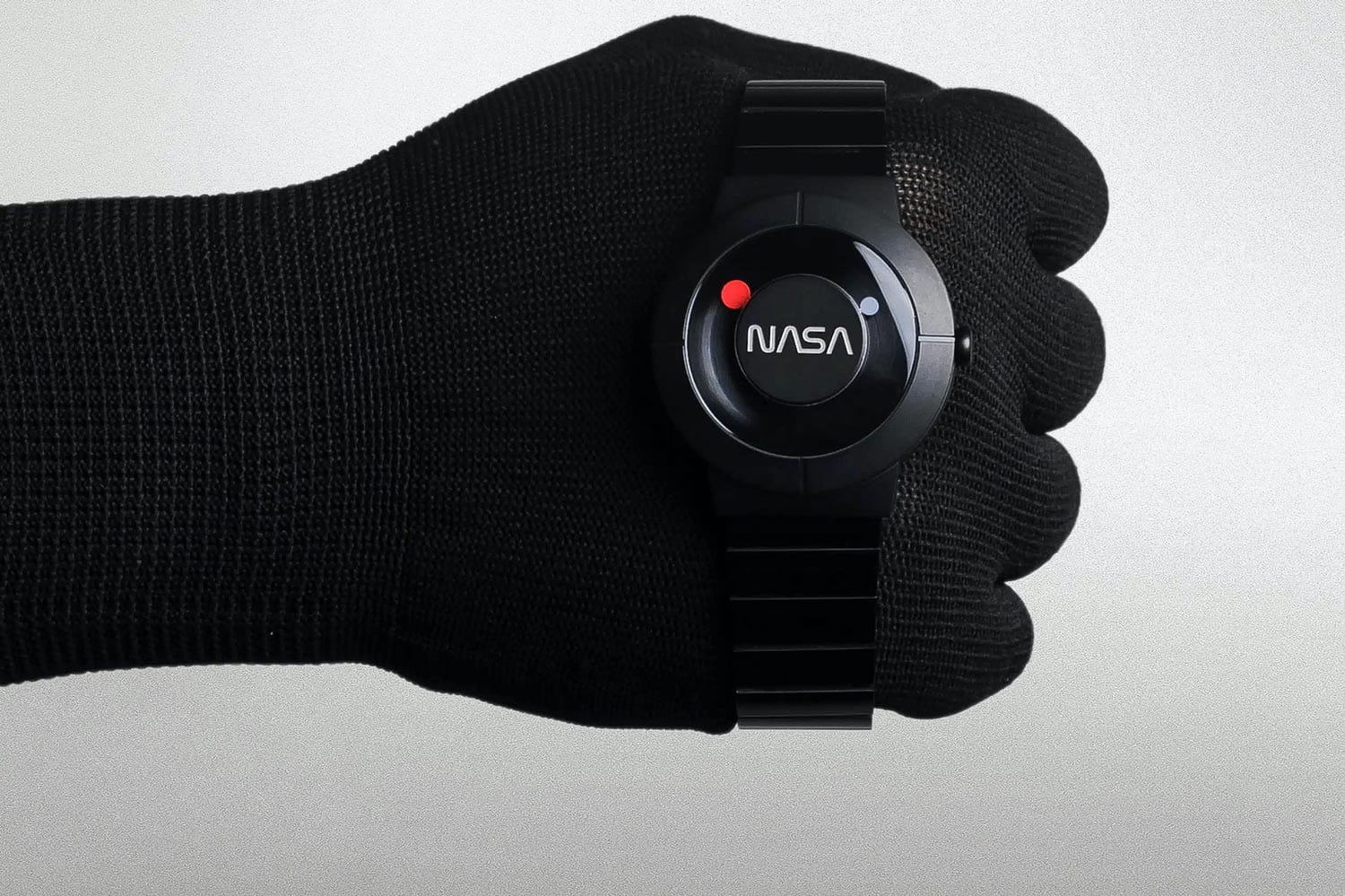 het beroemde logo. De wijzerplaat komt overeen met het levendige blauw van het NASA-gehaktballogo en heeft vergelijkbaar rode accenten op de aluminium binnenring rond de wijzerplaat en op de secondewijzer. Geinig detail: op de binnenring zit ook een ‘aftel-indicator’ van ‘10 seconds until blast-off’. Nog een tof detail is de aluminium boutvormige kroon – gegraveerd met de letters L en O (Locked en Open) –verwijzend naar de naar de navelstrengconnectoren die op ruimtepakken zitten. De kast meet 40 millimeter, is gemaakt van 70 procent gerecycled ruimtetitanium en hierin huist het Miyota 9039-uurwerk.