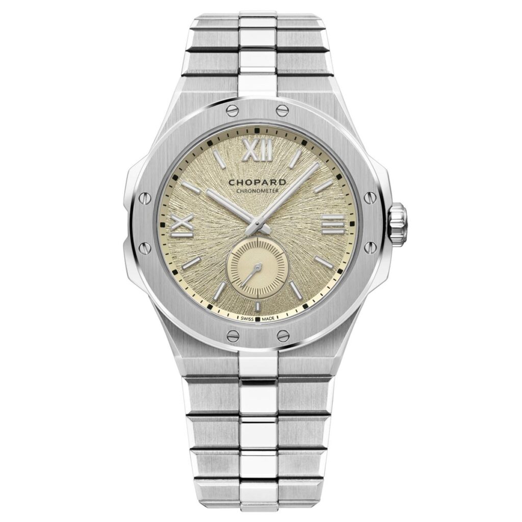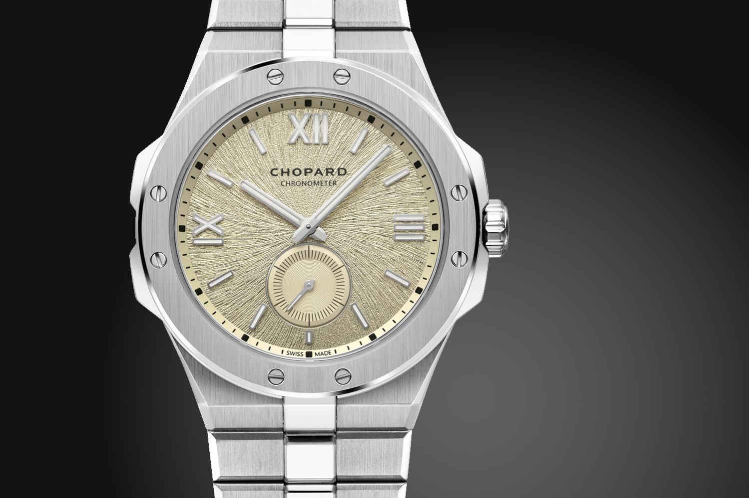 Met een champagnekleurige wijzerplaat geeft Chopard de Alpine Eagle 41 XPS een nieuwe uitstraling. Het ultradunne model combineert sportieve lijnen met een warmere nuance.