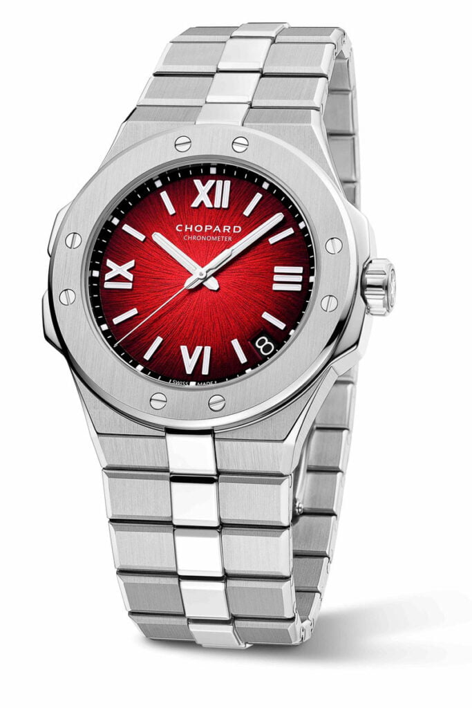 De Chopard Alpine Eagle Sunburnt heeft een diameter van 41 millimeter en is aan de voor- en achterkant uiteraard voorzien van de kenmerkende acht schroeven. Trouw aan de toewijding aan duurzame luxe zijn de kast en de band gemaakt van Lucent Steel, dat voor tachtig procent uit gerecycled materiaal bestaat. Het heeft bovendien vergelijkbare eigenschappen als chirurgisch staal; dat wil zeggen dat het zeer hard is, minder corrosiegevoelig dan regulier staal en in hoge mate antiallergisch.