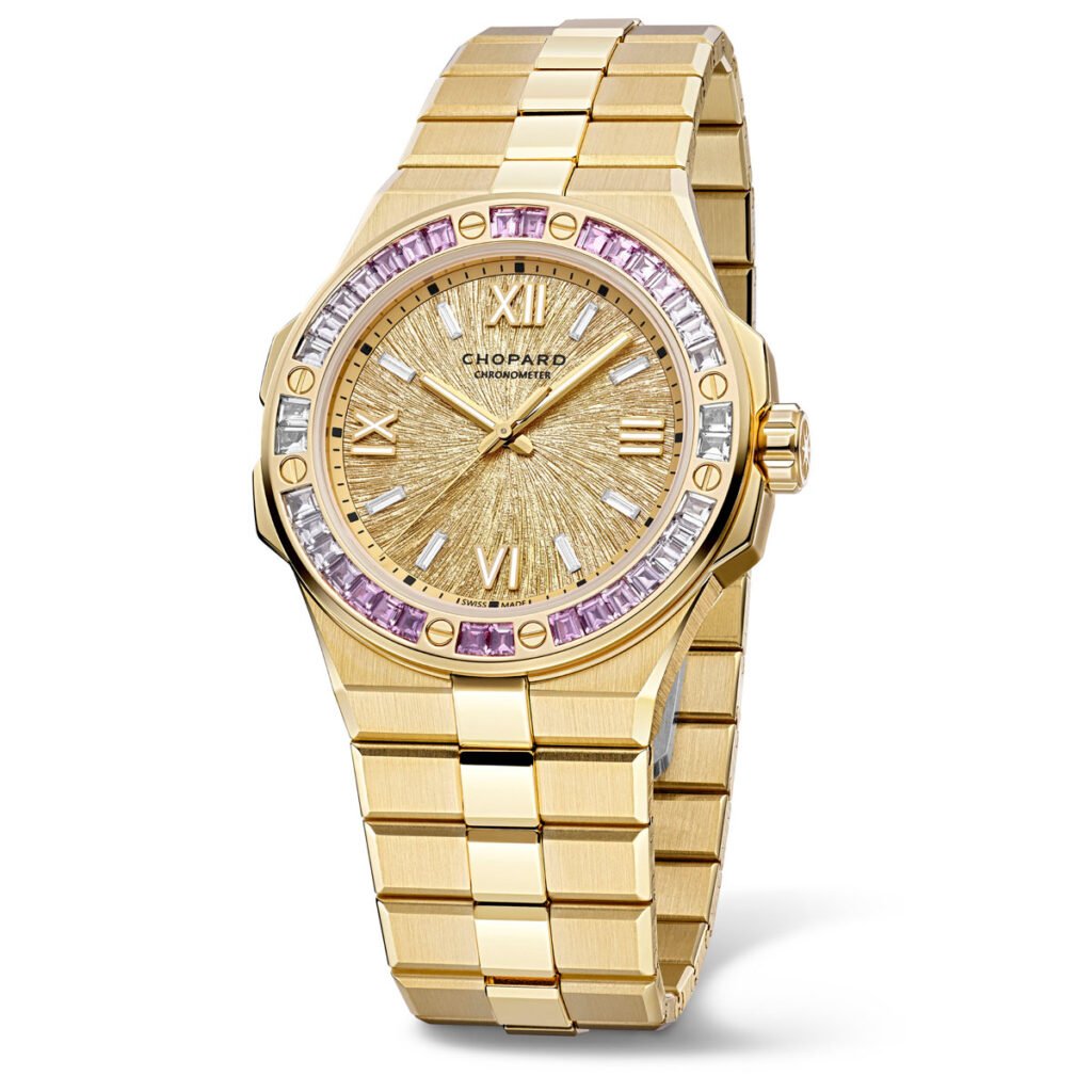 Deze serie Alpine Eagle Summit-horloges is verkrijgbaar in vier combinaties van ethisch goud en edelstenen in een subtiel kleurverloop: geelgoud en roze saffieren, witgoud met blauwe en paarse saffieren, witgoud en tsavorieten, maar ook roségoud en spessartieten. Elk van deze modellen is voorzien van de emblematische wijzerplaat met de tekening van een adelaarsoog, een stralend patroon in de luminescerende tinten die de identiteit van de collectie bepalen.