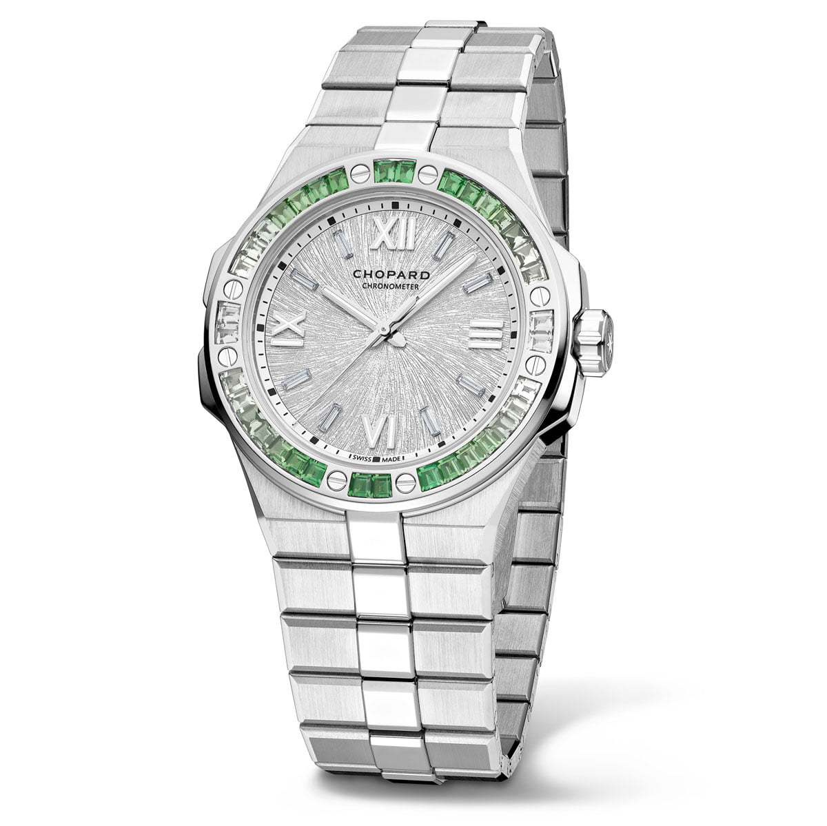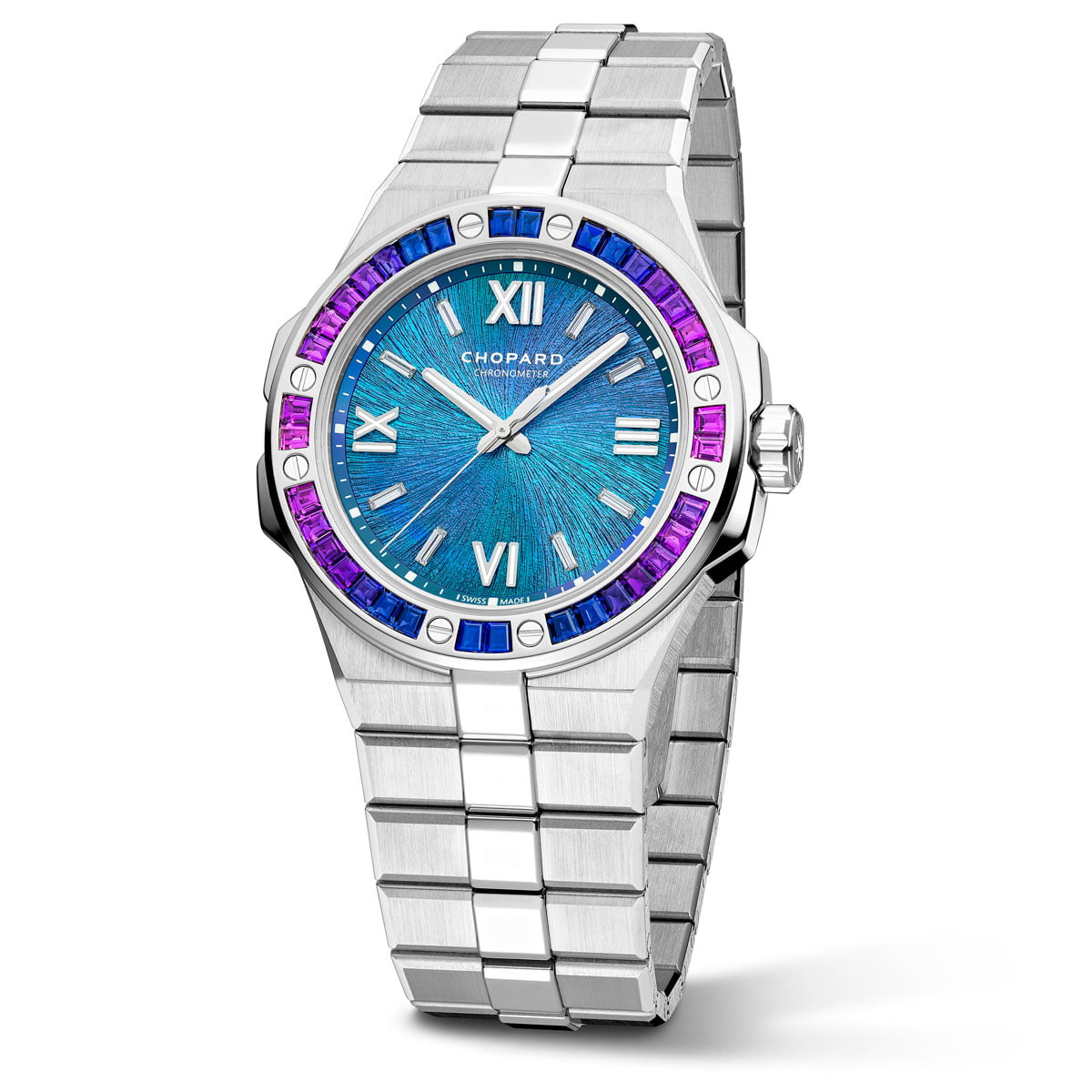 Deze serie Alpine Eagle Summit-horloges is verkrijgbaar in vier combinaties van ethisch goud en edelstenen in een subtiel kleurverloop: geelgoud en roze saffieren, witgoud met blauwe en paarse saffieren, witgoud en tsavorieten, maar ook roségoud en spessartieten. Elk van deze modellen is voorzien van de emblematische wijzerplaat met de tekening van een adelaarsoog, een stralend patroon in de luminescerende tinten die de identiteit van de collectie bepalen.