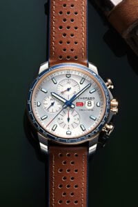 Tot slot is het Mille Miglia 2022 Race Edition-horloge voorzien van een band van lichtbruin geperforeerd kalfsleer. Het profiel aan de binnenkant ervan is geïnspireerd op Dunlop racebanden uit de jaren zestig.