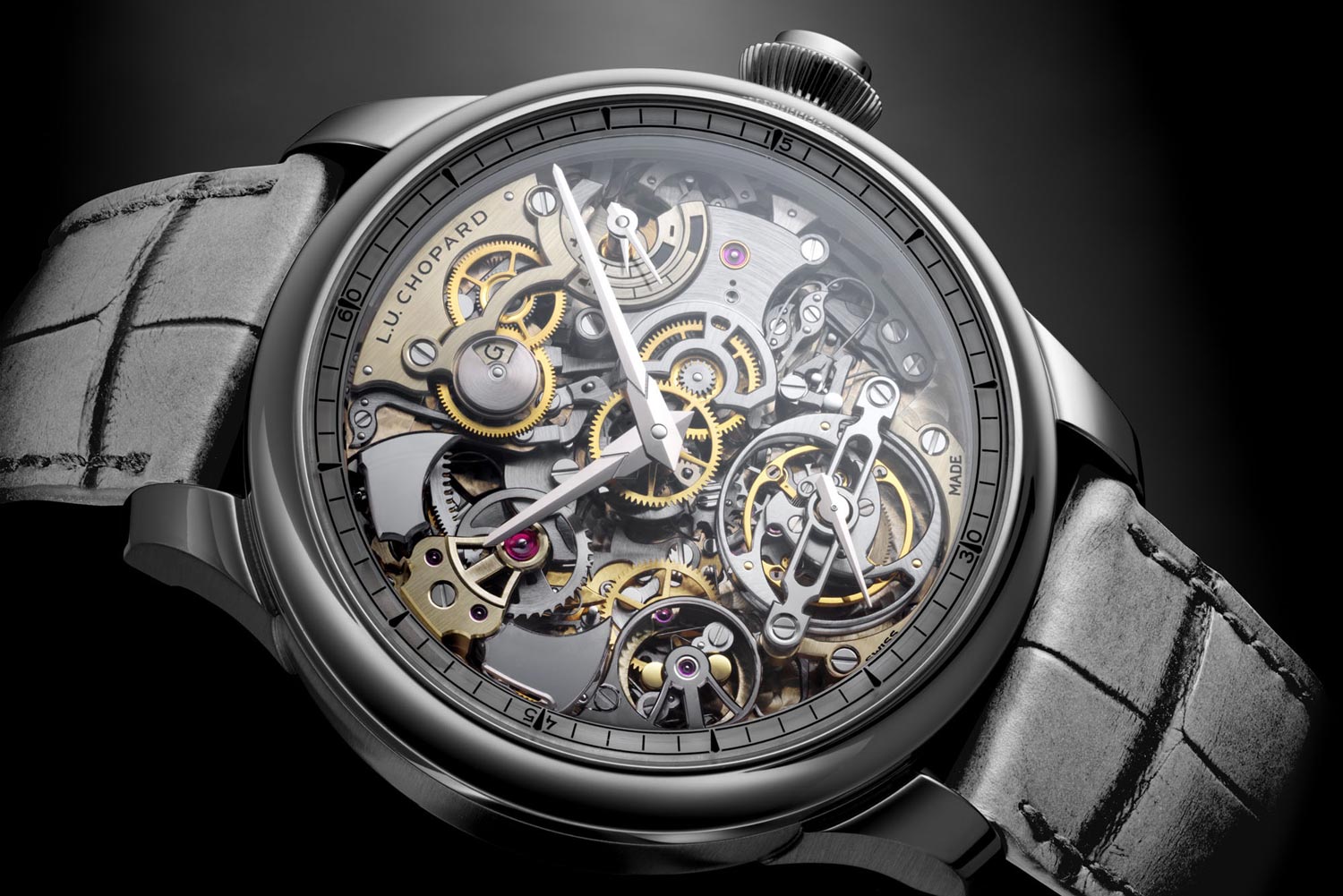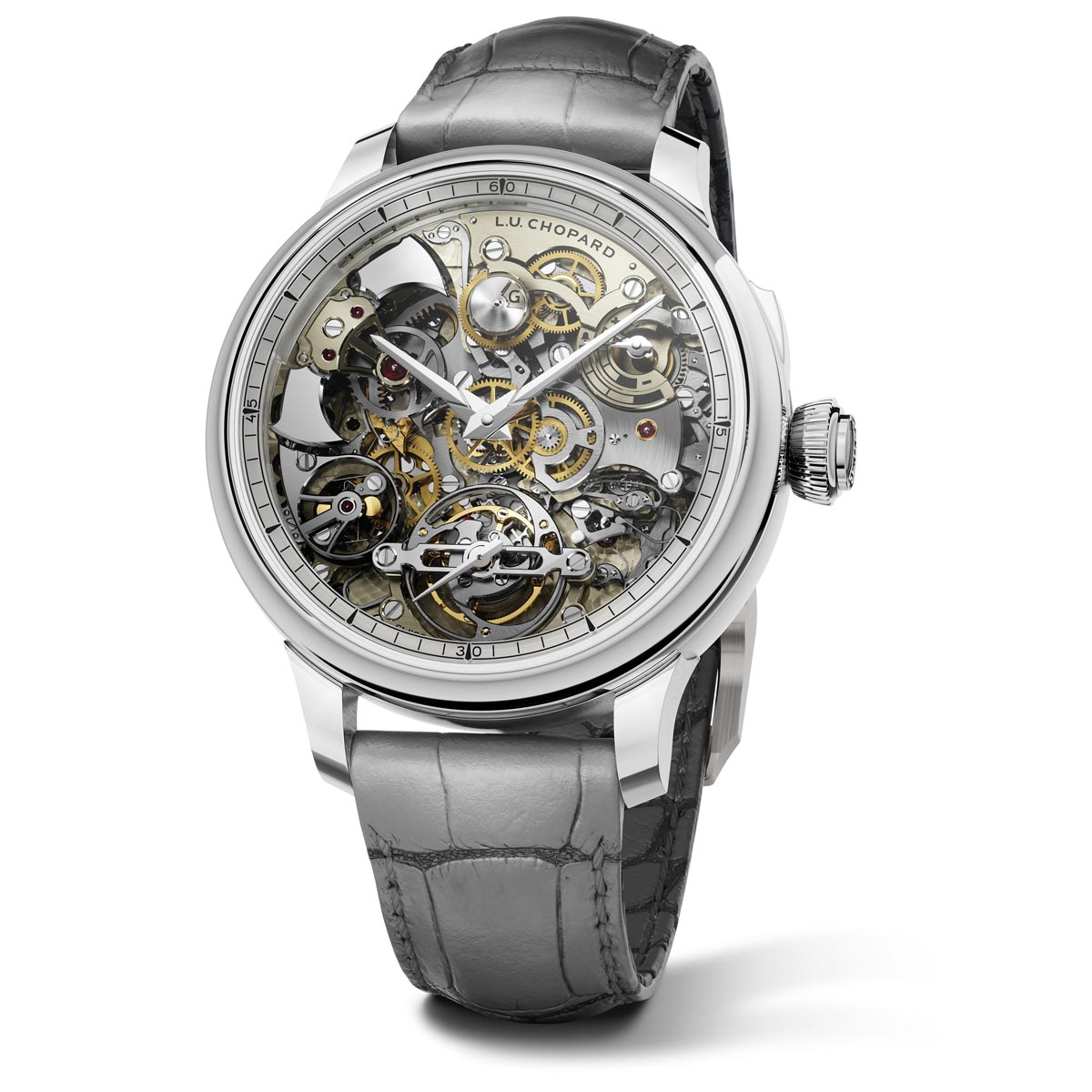 De L.U.C Grand Strike is uitgevoerd in een 43 mm kast van 18 karaat ethisch verantwoord witgoud, met een saffierglazen achterzijde en een subtiel geïntegreerde pusher in de kroon. De opengewerkte wijzerplaat biedt zicht op het complexe binnenwerk, terwijl goudkleurige wijzers zorgen voor een klassieke uitstraling. Het model wordt geleverd met verwisselbare banden van grijs of donkerblauw alligatorleer.