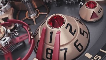 Also worth a closer look is the large inclined tourbillon, at 6 o’clock and adorned with a black chrome-plated aluminium skull designed by StingHD. To create this hypnotically fascinating sight by incorporating the ruby-eyed skull within the tourbillon required the creation of a new tourbillon cage – a technical development accentuated by the colossal case of the X-TREM-1 – StingHD. Like a high-powered machine perched on the wrist, the imposing titanium rectangle exudes a particularly potent appeal thanks to a remarkable black PVD treatment. The pure sapphire tubes previously framing the case of the X-TREM-1 and housing the steel hours and minutes spheres have been replaced by black PVD-treated stainless steel ring-bound tubes – thereby creating a resolutely technical look echoed by red lacquered numerals.