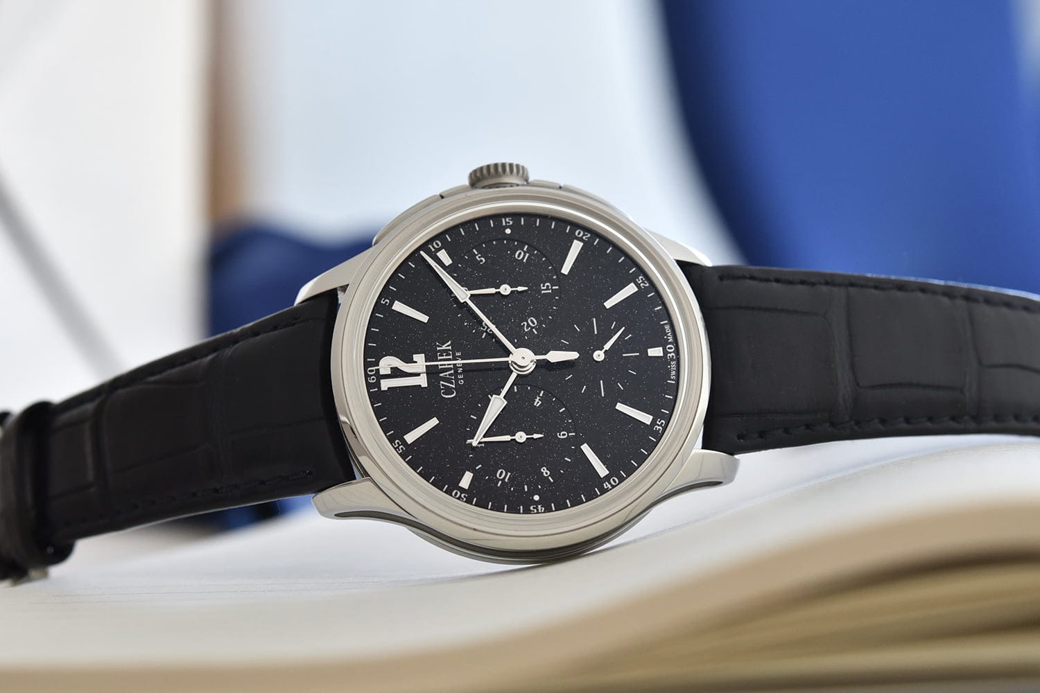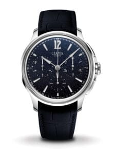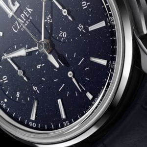 De Czapek Faubourg de Cracovie Aventurine heeft een kast met een diameter van bijna 42 millimeter en is als gezegd een chronograaf, wat door zijn tellers de uitdaging van het dunne glas alleen maar groter maakte. “Aventurine uitsnijden is een uitdaging op zich”, zegt Xavier de Roquemaurel, CEO van Czapek & Cie. “Als je daaraan toevoegt dat de indexen worden opgelegd en niet worden geschilderd, kun je zien hoe groot het risico op breuken tijdens de productie is. De keuze van de opgelegde markeringen op de donkerblauwe wijzerplaat is esthetisch, gericht op het geven van een sportievere uitstraling aan het uurwerk.”