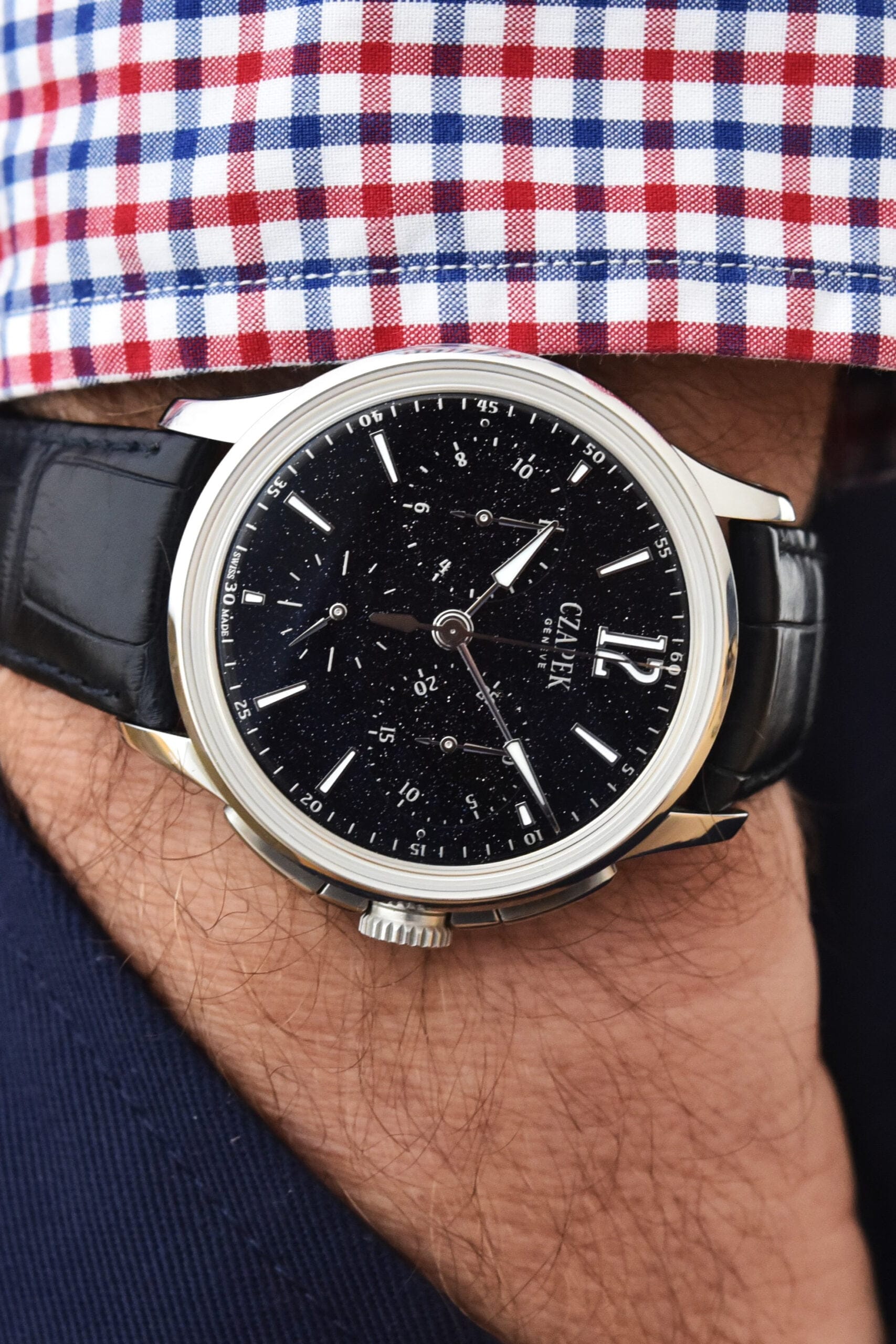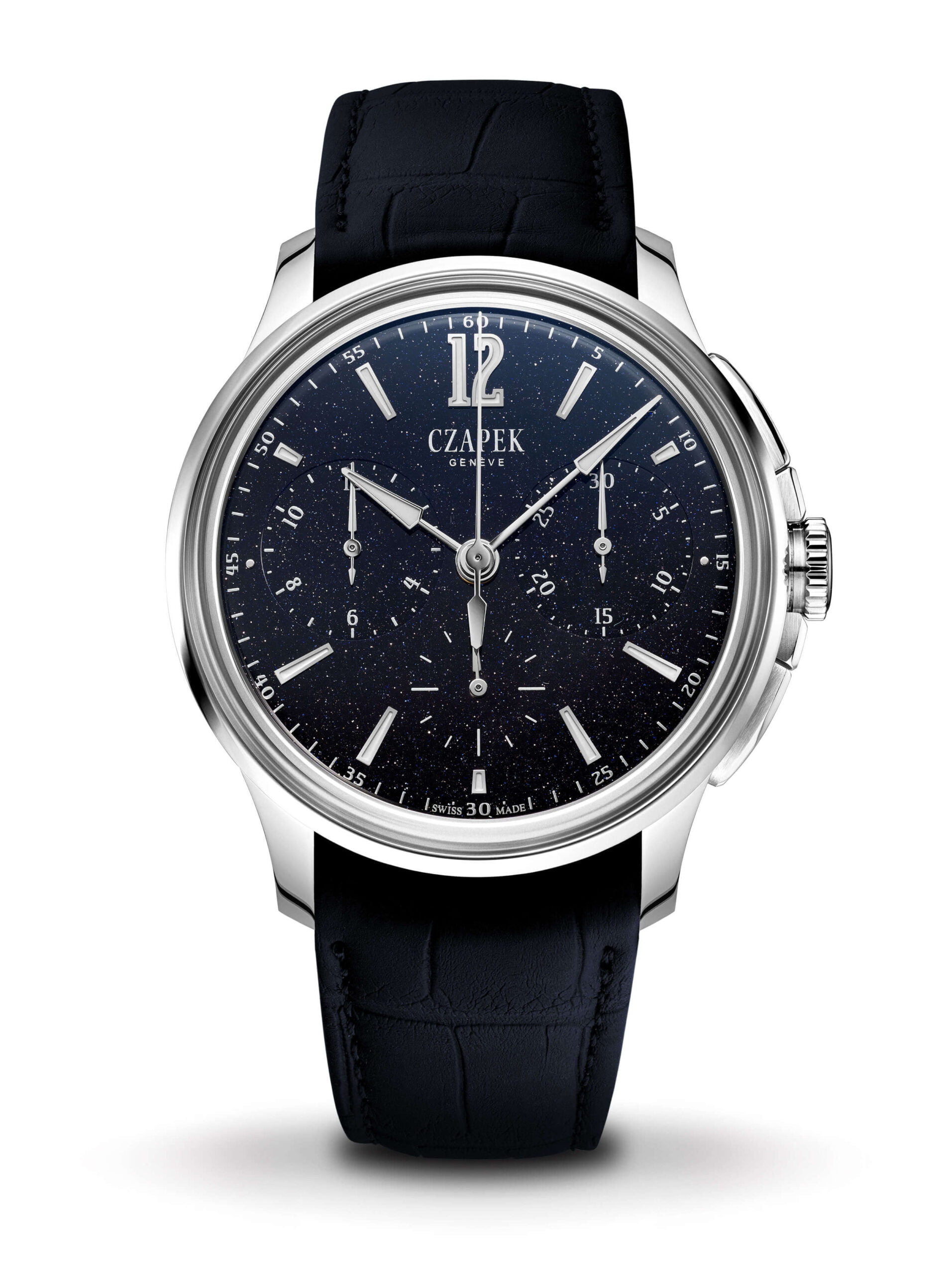 Het nog zo jonge Czapek & Cie blijft de horlogewereld verrijken met creaties die een zucht van geluk opwekken bij liefhebbers. Deze week introduceert het merk uit Genève een nieuw Faubourg de Cracovie-chronograafmodel, voor het eerst met een prachtige aventurine-wijzerplaat. Dit glasachtige materiaal zorgt voor een soort sterrenhemel-patroon en is notoir moeilijk te maken – reden waarom een groot deel van de productie uiteindelijk in de prullenbak belandt. Eerlijkheid gebiedt te zeggen dat je bij deze dure wijzerplaten dus ook betaalt voor de mislukte productie – al mag dat de pret van de schoonheid natuurlijk niet drukken.
