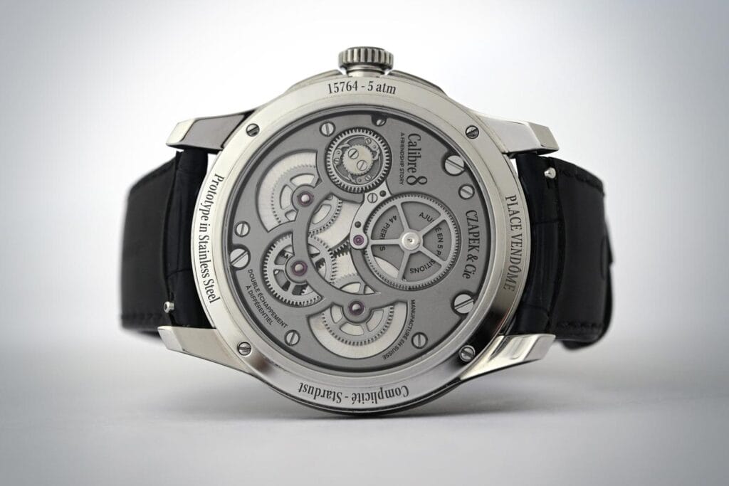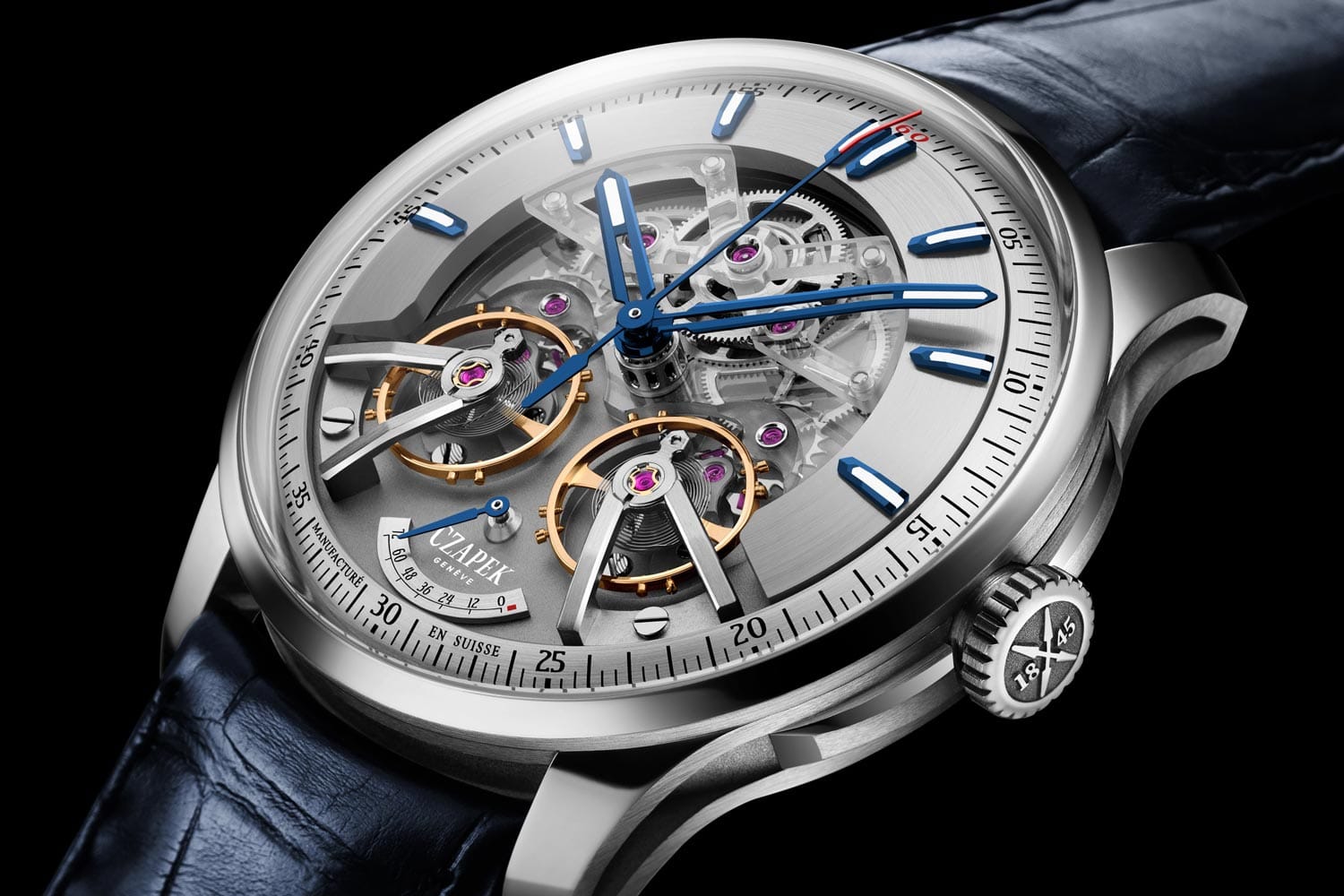 Het dubbele echappement in het horloge gebruikt twee balanswielen die onafhankelijk van elkaar bewegen. Ze worden allebei aangedreven door dezelfde veer via een mechanisme genaamd differentieel. Dit zorgt ervoor dat eventuele variaties in de snelheid van het horloge, bijvoorbeeld door de zwaartekracht of andere dagelijkse invloeden, worden gecompenseerd. Hierdoor blijft de nauwkeurigheid van de tijdmeting hoog. Op de wijzerplaat, tussen de balanswielen op 6 uur, is de resterende gangreserve af te lezen. De balanswielen zijn op driehoekige bruggen gemonteerd. De hele tandwieltrein aan de wijzerplaatzijde is te zien dankzij twee saffieren bruggen. Kenmerkend voor Czapek zijn de subtiele details, zoals het opengewerkte ontwerp van de wijzeras, wat een klein effect van ‘arcade des heures’ creëert voor extra esthetiek.