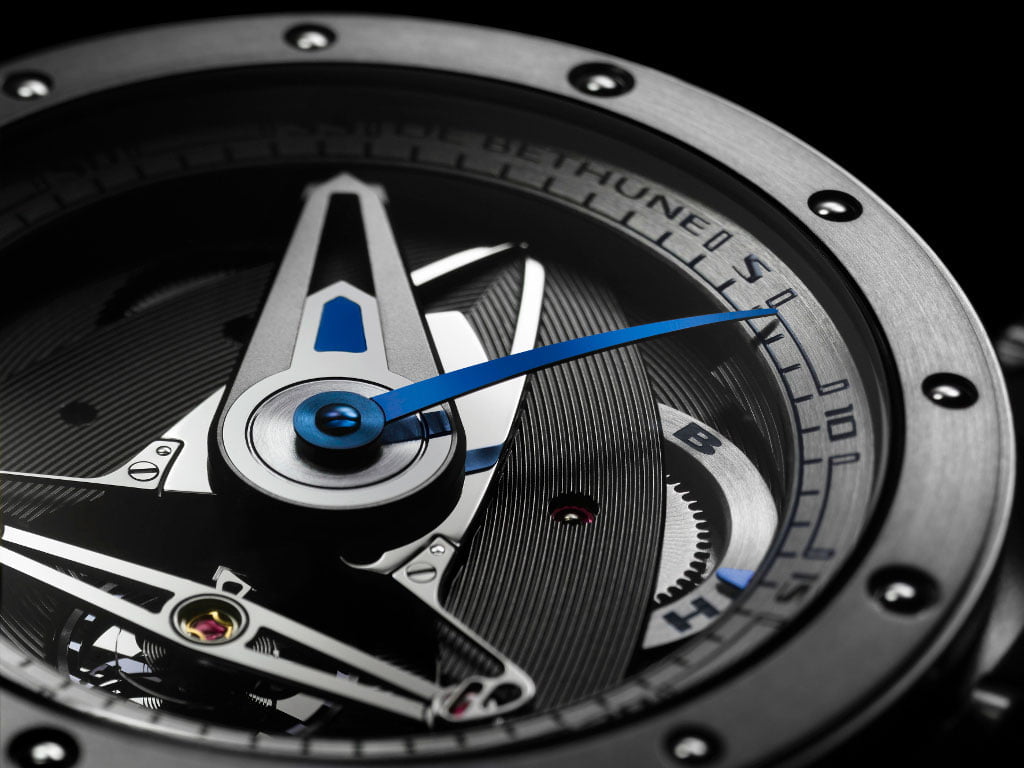 With the DB28 GS De Bethune shows that they are not afraid to use strong design language. With respect to technology the DB28 GS is also a display of pure muscle. The hand-finished movement components are a pleasure to behold. In the atelier in L’Auberson the triangular bridge is polished smooth, the platine and other bridges are given a microlight decoration and the azure blue colour of the hands is achieved with a traditional heating technique.