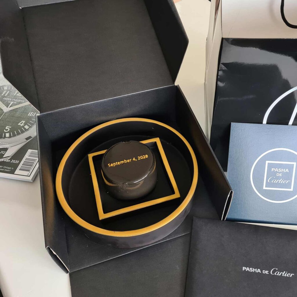 Op een passende Covid-19 wijze, met een authentieke Cartier piccolo voor onze hoofdingang, werd een geweldige taart van meesterchef Frank Haasnoot op onze redactie bezorgd. Een ware smaakexplosie en qua design een zorgvuldig samenspel van vierkanten en rondingen, net als de Cartier Pasha zelf!