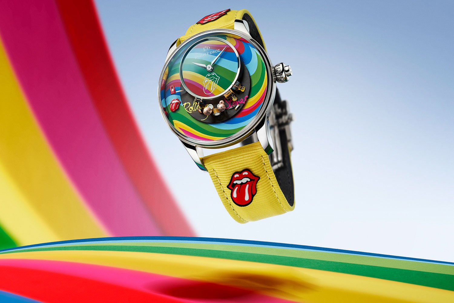 Voor zijn Rolling Stones Automaton heeft Jaquet Droz een kleurrijke animatie ontworpen die doet denken aan nachtlampjes en tollen voor kinderen, met kleuren en roterende schijven die de uitrusting van de legendarische band laten zien – allemaal met de hand vervaardigd.