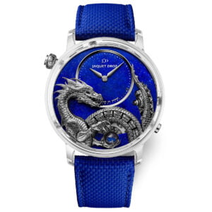 Twee jaar geleden onthulde Jaquet Droz een van de meest complexe automatons ooit geproduceerd voor een polshorloge: de Dragon Automaton, met zestien bewegende delen en negen animaties. Nu is Jaquet Droz nog verder gegaan op het gebied van verfijning en moeilijkheidsgraad door een kast van saffierkristal en een lapis lazuli-wijzerplaat toe te voegen. Dat maakt de Dragon Automaton Sapphire – Lapis Lazuli een uniek stuk.