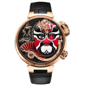 Met de Tambour Opera Automata brengt Louis Vuitton een eerbetoon aan Bian Lian van de Sichuan Opera, een Chinese kunstvorm met maskers waarmee de drager van gezicht verandert. In dit horloge is de automaton een traditioneel masker dat tot leven komt en op verzoek van uitdrukking verandert. Het Bian Lian-masker gaat van vreugde naar verdriet door de beweging van zijn kin en drukt een breed scala aan emoties uit. De tijd wordt alleen weergegeven als de knop van de automaat wordt geactiveerd: de gegraveerde roze gouden drakenkop gaat omhoog en onthult de jumping hours die op het voorhoofd van het cloisonné-emaille Bian Lian zijn gegraveerd, terwijl de staart de retrograde minuten aangeeft. De uitdrukking van het masker verandert dramatisch: de wenkbrauwen fronsen, het ooglid sluit zich over het linkeroog en de pupil van het rechteroog trekt zich terug en onthult een puntige monogrambloem.