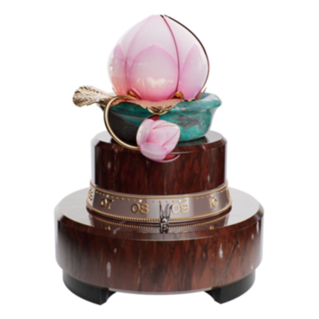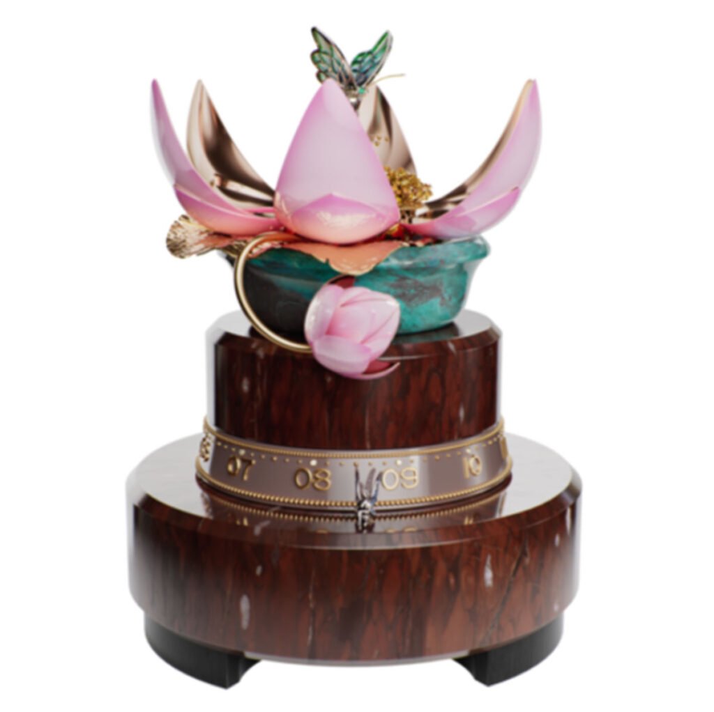 De natuur, een van de geliefde thema’s van Van Cleef & Arpels, komt tot leven met de Floraison du Nénuphar-automaton, die een droomachtige interpretatie van het verstrijken van de tijd presenteert. Terwijl de uren voorbij tikken op een roterende ring aan de voet van het object, toont zich een betoverend schouwspel. Op een sokkel van griotte-marmer en in een schaal van shattuckiet opent een waterlelie haar gelakte bloemblaadjes om een kostbare vlinder vrij te laten, versierd met turkoois en diamanten. De geëmailleerde plique-à-jour vleugels fladderen een paar ogenblikken voordat ze terugkeren naar het hart van de bloemkroon, die subtiel sluit om het einde van de animatie aan te geven. De animatie, geproduceerd in samenwerking met de werkplaats van François Junod, wordt begeleid door een kristalheldere melodie om dit betoverende moment compleet te maken.