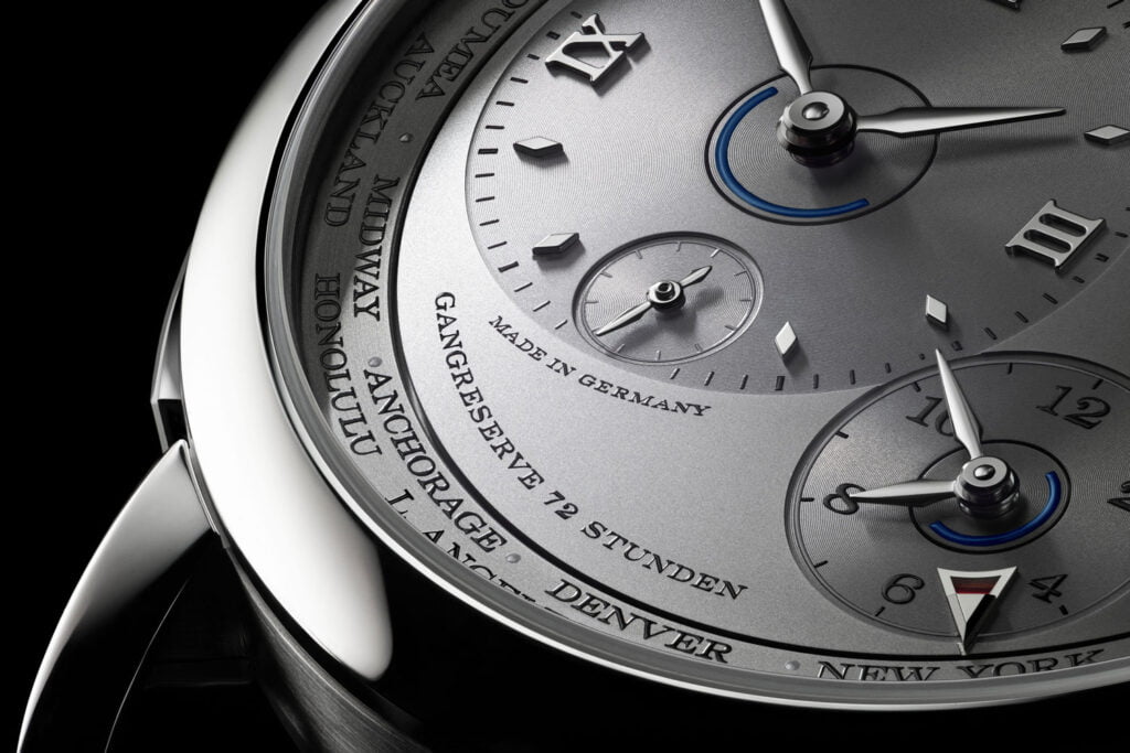 Hoewel nieuw in uiterlijk is de basis van de Lange 1 Time Zone hetzelfde gebleven. Het is immers het uurwerk waarmee het bij de liefhebber punten scoort. Dat het uurwerk ingewikkeld in elkaar steekt, wordt al duidelijk door de wijzerplaat. Het ontwerp op de wijzerplaat oogt logisch, maar alle extra informatie is niet ten koste gegaan van de typerende, niet-gecentreerde wijzerplaatarchitectuur van de Lange 1-horlogefamilie. Door het plaatsen van de ring met de 24 referentiesteden aan de rand blijft het kenmerkende design overeind en is er ook nog genoeg ruimte voor een oversized datum en de gangreserve aanduiding. Alle displays zijn op elk moment duidelijk zichtbaar.