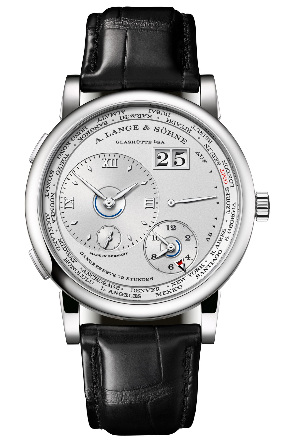 Wie vakantie viert of plannen maakt voor een verre reis, zal in de nieuwe Lange 1 Time Zone een perfecte reisgenoot vinden. Een reisgenoot die gezien mag worden met een platinum kast en rhodium wijzerplaat. Een gecompliceerde reisgenoot bovendien, maar dan op de juiste manier, want het succesmodel van A. Lange & Söhne biedt een intuïtieve weergave van de tijd in 24 tijdzones.
