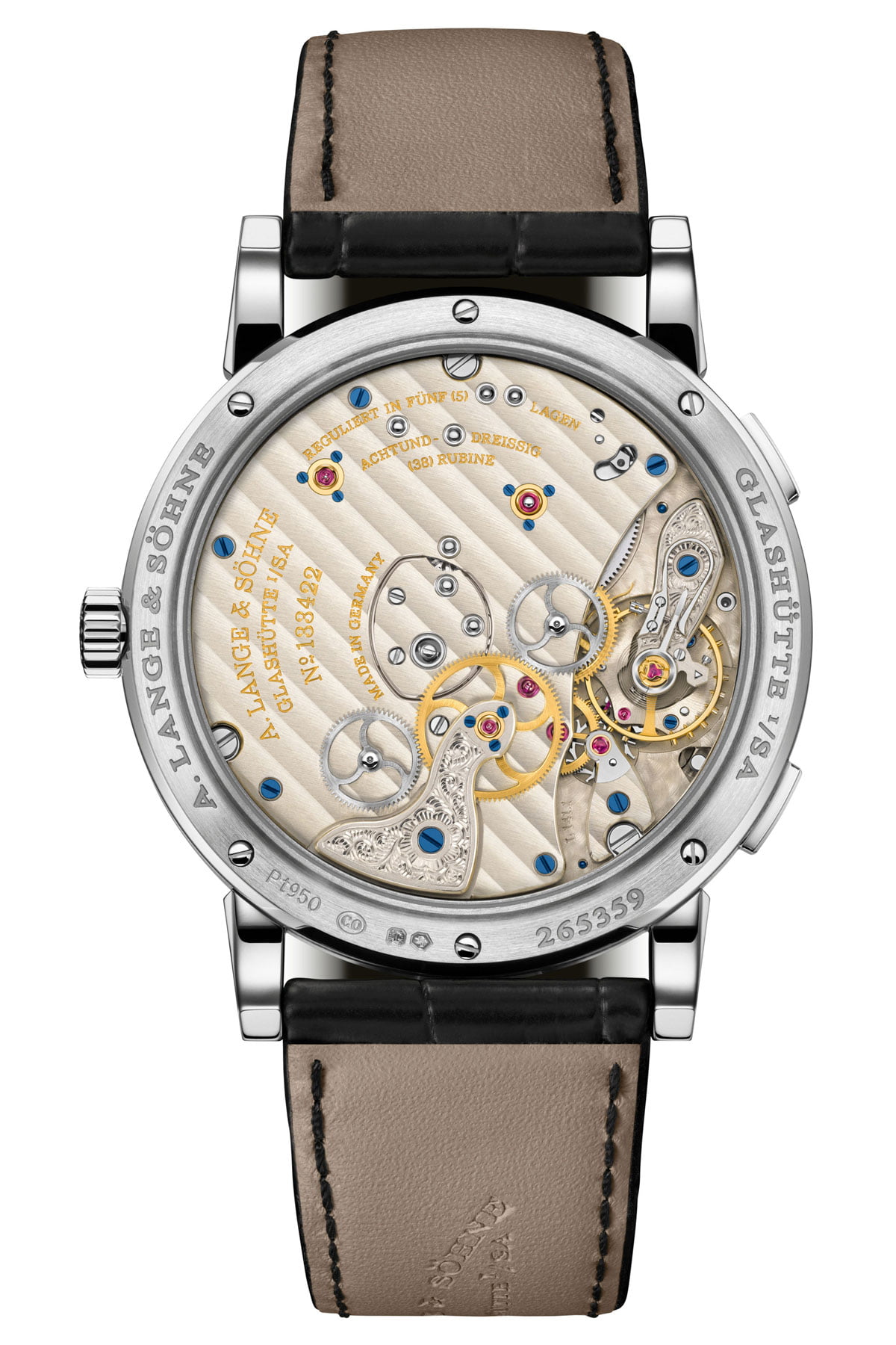 Achter het logische geheel op de wijzerplaat schuilt het gecompliceerde uurwerkkaliber L141.1. Hiervan is de tijdweergave in twee tijdzones het meest indrukwekkende onderdeel. De Lange 1 Time Zone geeft in de grotere wijzerplaat de thuistijd aan, en de kleinere sub-wijzerplaat toont de tijd in een tweede tijdzone. Als de correctorknop om 8 uur wordt bediend, verspringt de stedenring één tijdzone in oostelijke richting. Tegelijkertijd gaat de uurwijzer in de kleine secundaire wijzerplaat een uur vooruit en geeft nu de zonetijd van de stad aan – en de bijbehorende tijdzone – waarnaar de pijlmarkering wijst. De aanduiding van de zomertijd vormt een verfijnd technisch kenmerk. Een kleursegment in de pijl geeft aan of de geselecteerde stad en tijdzone zomertijd toepassen. Als dit het geval is, wordt de kleine opening rood opgevuld. Als op deze plaats het hele jaar door de standaardtijd wordt aangehouden, blijft de achtergrond ongewijzigd.