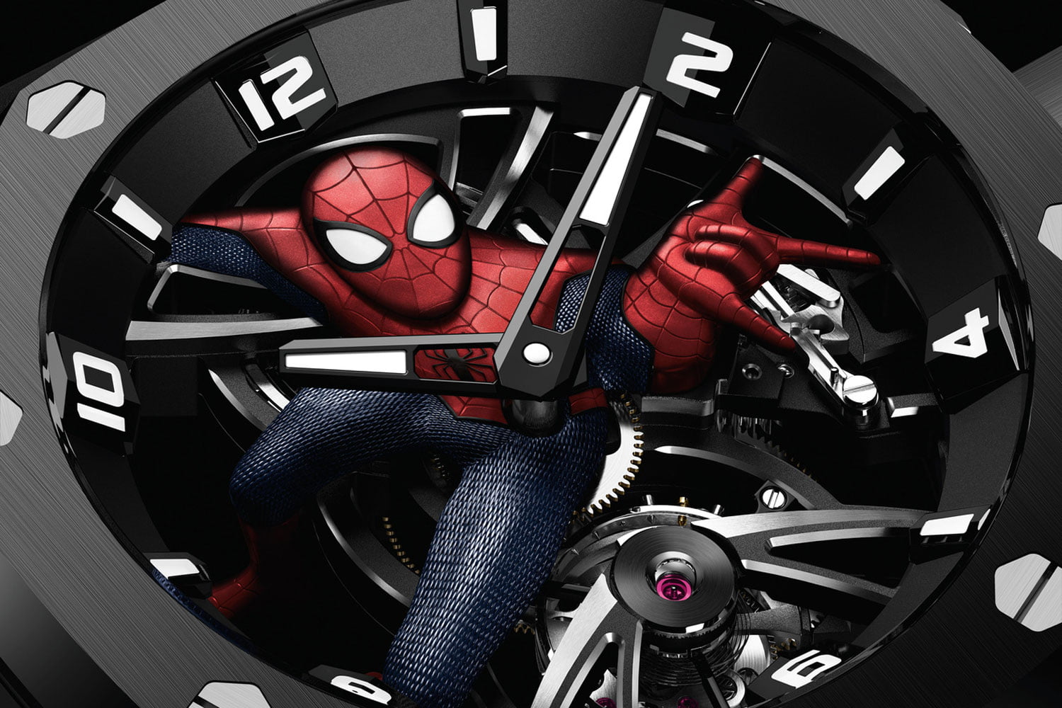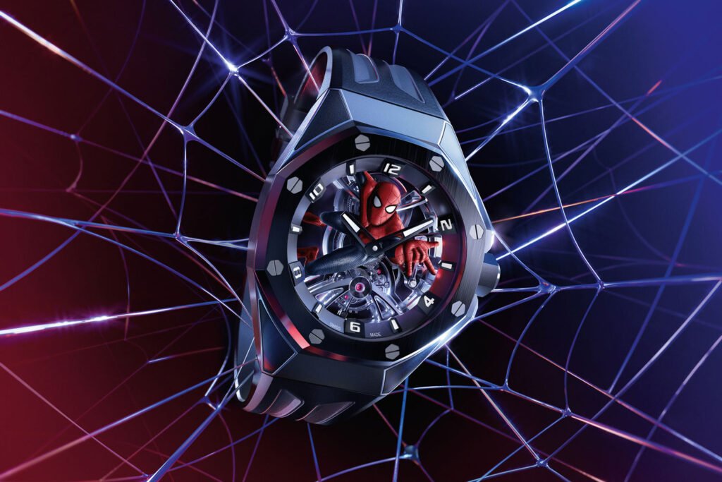 Dat Spider-Man geen uitdaging te groot is, weten we allemaal, maar in een tourbillon zagen we hem nog niet eerder. Het horloge waarin de superheld van Marvel verzeild is geraakt, is de Royal Oak Concept Tourbillon ‘Spider-Man’ van Audemars Piguet. Gepresenteerd in een titanium kast met een contrasterende zwarte keramische ring en kroon, onthult het opengewerkte uurwerk kaliber 2974 de superheld in zijn iconische rode en blauwe pak.