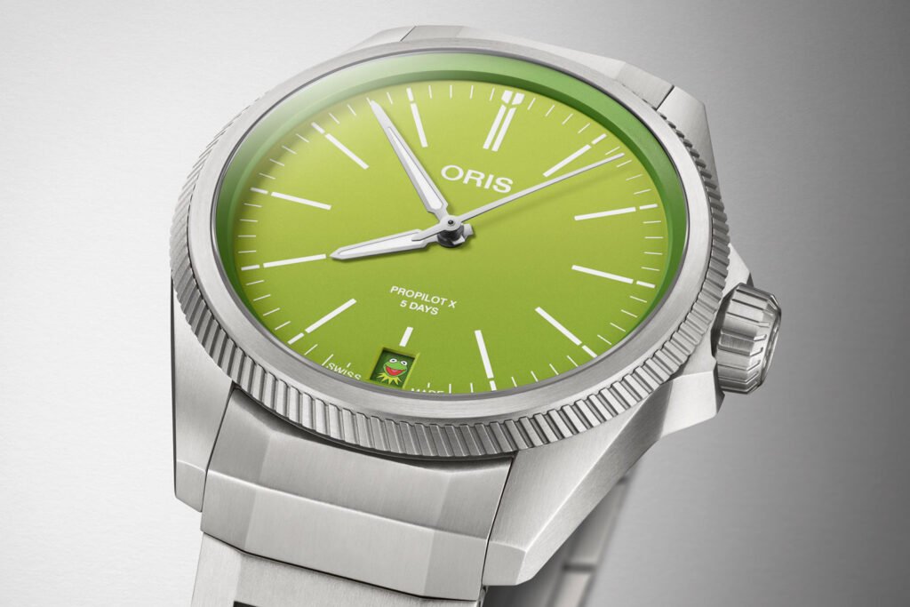Waarom horlogemerken nu ineens wel grappen durven te maken? Het antwoord op die vraag vinden we in de Pro-Pilot x Kermit Edition van Oris. Het merk heeft gekozen voor een vrolijke kikker die elke eerste van de maand verschijnt in het datumvenster van een knalgroene wijzerplaat. Creatief directeur Ken Laurent legt uit wat hier het doel van is: “We praten veel over de functie van horloges in de letterlijke zin van het woord, maar het echte doel van een Oris horloge is om mensen te laten lachen. En dat doen we met de ProPilot X Kermit Edition. De functie van dit horloge is simpel: om vreugde te brengen.”