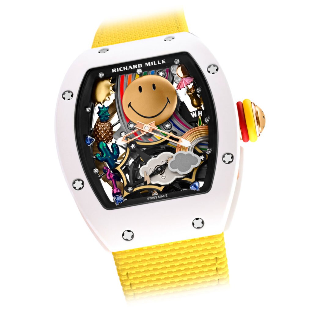 De glimlach is universeel en fundamenteel voor onze sociale interacties. Dat geldt ook voor de Smiley, het kleine gele gezichtje dat in 1972 verscheen en al snel viraal ging. Het symbool dat positieve energie uitstraalt, staat centraal in de RM 88 Automatic Tourbillon Smiley van Richard Mille. Het automatische tourbillon-kaliber wordt geflankeerd door decoratieve elementen als een vrolijke uiting van de Smiley-wereld. Een bloeiende bloem, de warme zonnestralen, een heerlijke ananas, een bloeiende cactus, een roze flamingo en een felgekleurde regenboog. Samen vormen ze een neonpopscene die vrolijk maakt.